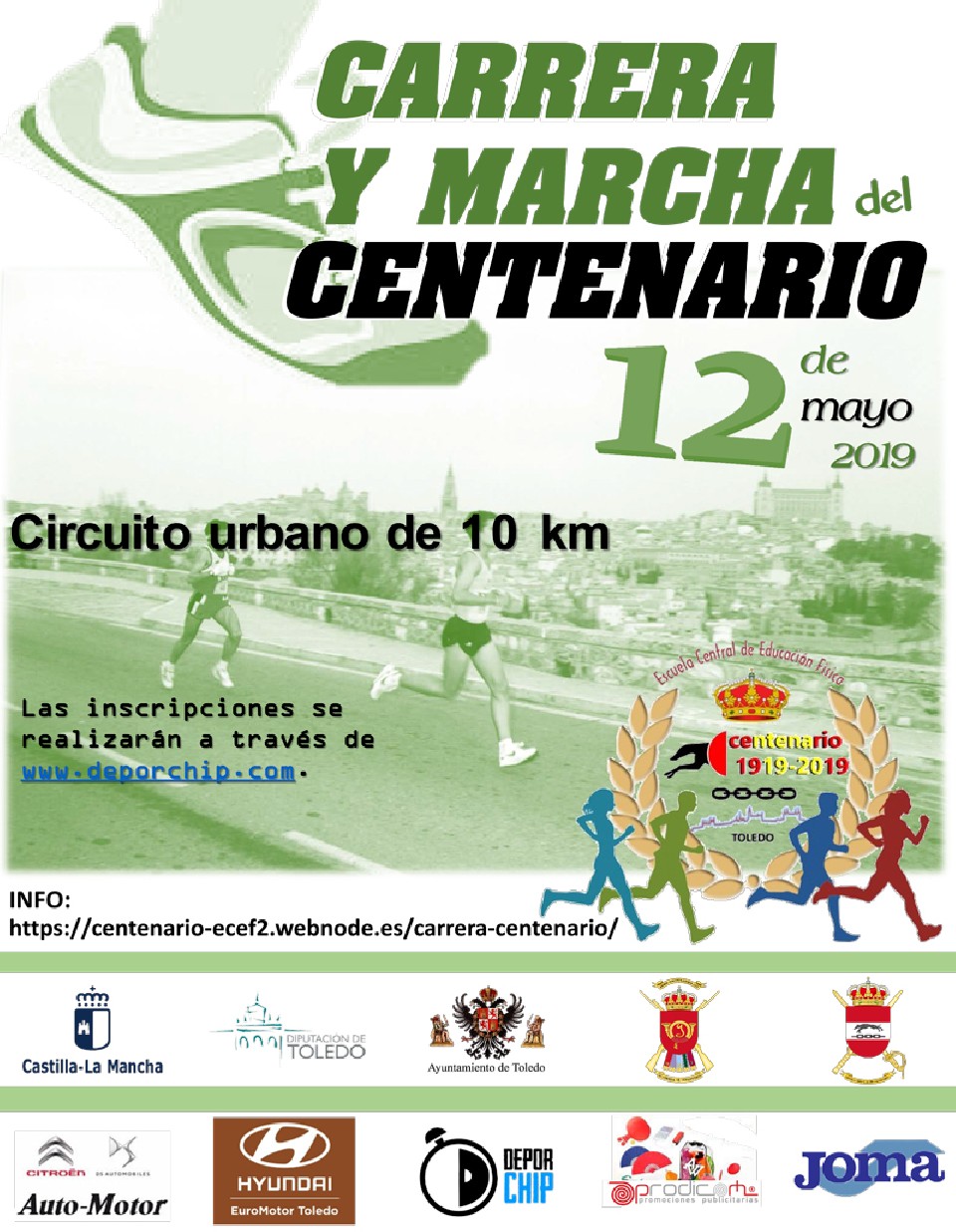 Sailkapenak CARRERA 10K MAS Y FEM - Cierre de Inscripciones 08/05/2019 - Hasta las 23:59h 12/05/2019 10:00 10km Sailkapenak ikusi MARCHA A PIE MAS Y FEM - Cierre de Inscripciones 08/05/2019 - Hasta las 23:59h 12/05/2019 09:00 10km Sailkapenak egiteke Kontaktuaren informazioa Antolatzailearekin harremanetan jarri – Araudia http://www.deporchip.com/eventos/pruebas2019/centenarioacademiatoledo19/reglamento.pdf