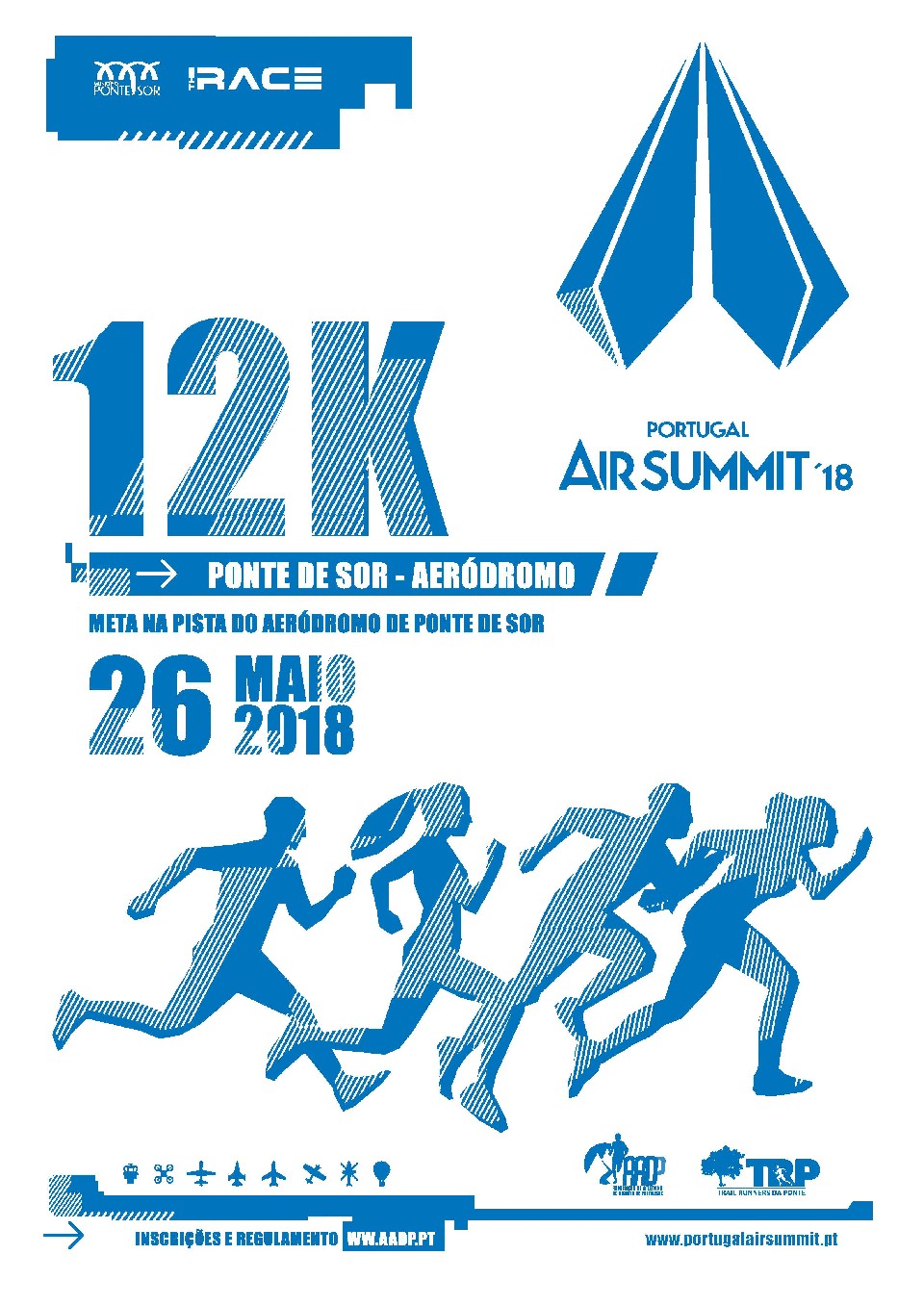 O Clube de Atletismo Trail Runners da Ponte vai realizar, no dia 26 de maio de 2018, a “CORRIDA AIR SUMMIT” na Cidade de Ponte de Sor, Distrito de Portalegre, Alto Alentejo, com o Apoio do Município de Ponte de Sor, FabLab Alentejo, Bombeiros Voluntários de Ponte de Sor e GNR de Ponte de Sor e com a Colaboração Técnica da Associação de Atletismo do Distrito de Portalegre.