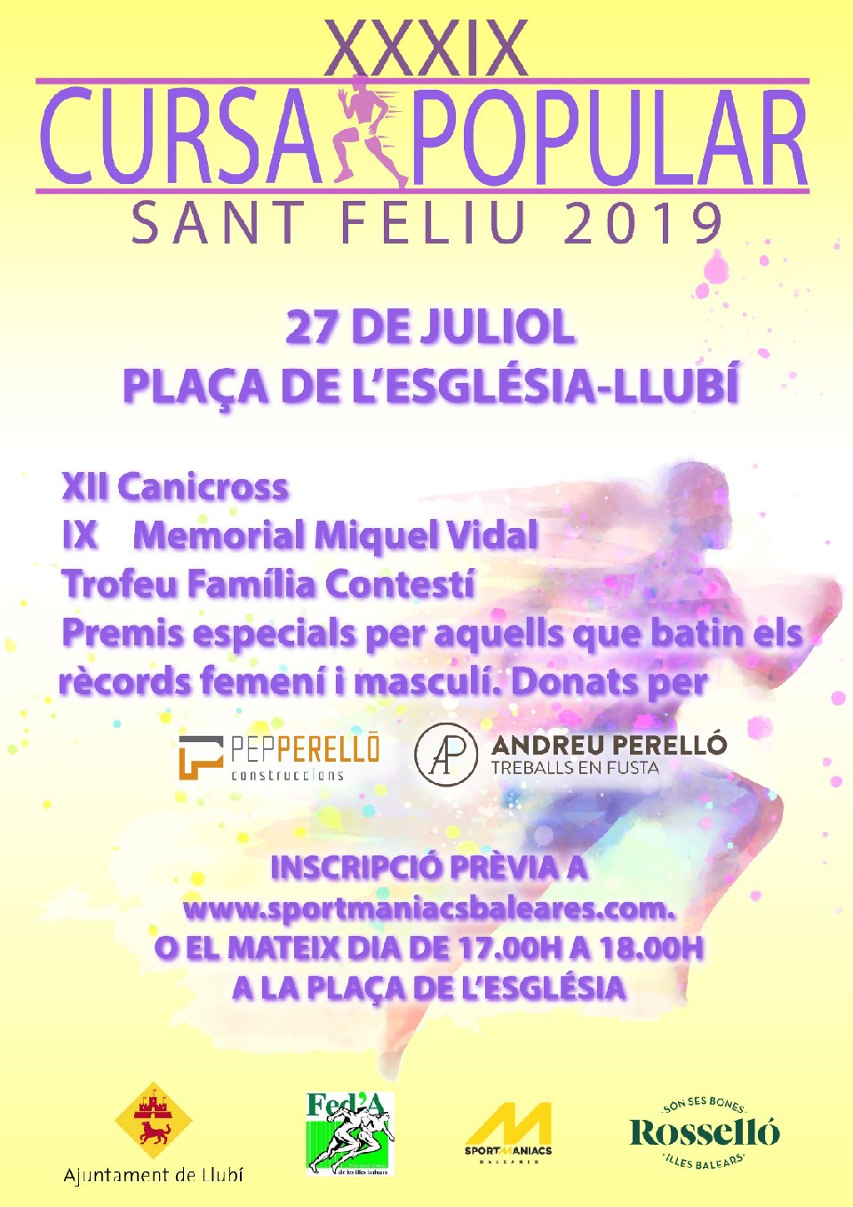 1.-L’àrea d’esports de l’Ajuntament de Llubí, organitza el 27 de juliol la “XXXIX Cursa Popular Sant Feliu 2019 – 9è. Memorial Miquel Vidal” amb un recorregut de 5.500m. En el casc urbà del municipi de Llubí. La sortida de la prova té lloc a la Plaça de l'Esglèsia i finalitza en el mateix lloc.