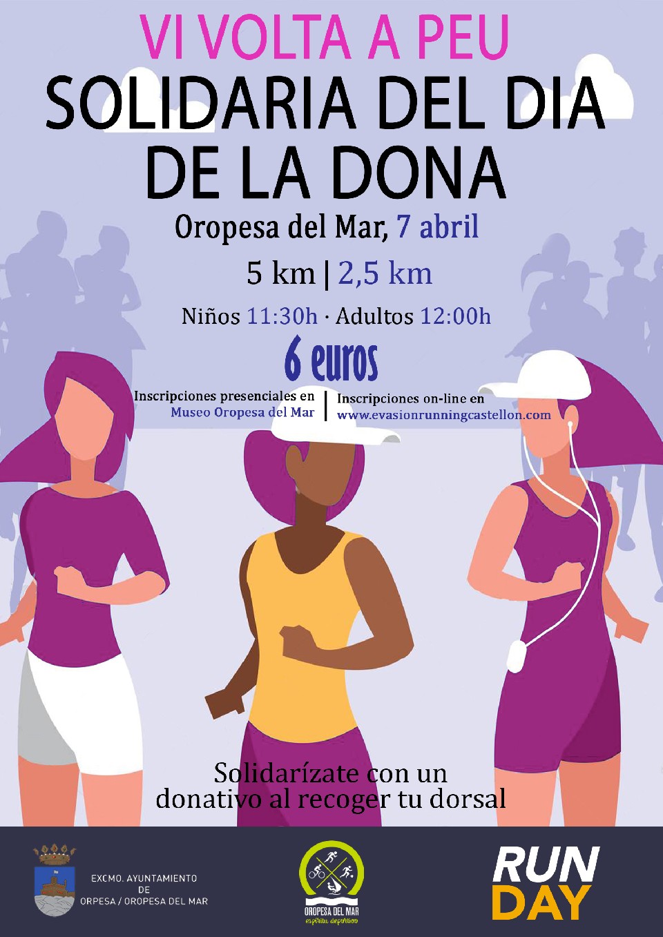 El Excelentísimo Ayuntamiento de Oropesa del Mar organiza con el asesoramiento técnico de Runday la VI VOLTA SOLIDARIA DEL DIA DE LA DONA, prueba atlética en la que podrán participar todas las personas que lo deseen, debidamente inscritas, nacidas hasta 2007. Con esto queremos ofrecer a todos/as los ciudadanos de Oropesa y proximidades la posibilidad de participar y disfrutar del running en esencia pura, para que todos/as sin distinción de sexo, edad, y nivel deportivo podamos salir a la calle a hacer lo que más nos gusta “CORRER” y así hacer aún más grande si cabe la práctica del Atletismo y fomentar la vida saludable y deportiva.