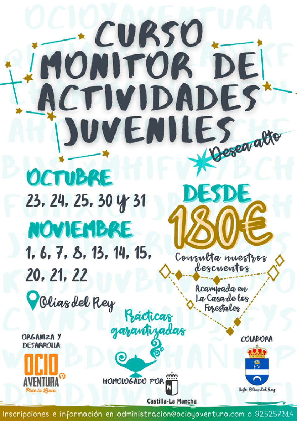 Sailkapenak PAGO DE RESERVA CURSO MONITOR 100€ Sailkapenak egiteke PAGO RESTANTE CURSO MONITOR SI PROCEDE 80€ Sailkapenak egiteke PAGO RESTANTE CURSO MONITOR SI PROCEDE 90€ Sailkapenak egiteke PAGO RESTANTE CURSO MONITOR SI PROCEDE 100€ Sailkapenak egiteke Kontaktuaren informazioa Antolatzailearekin harremanetan jarri – 925257314 Araudia http://www.ocioyaventura.com/cursodemonitor.html