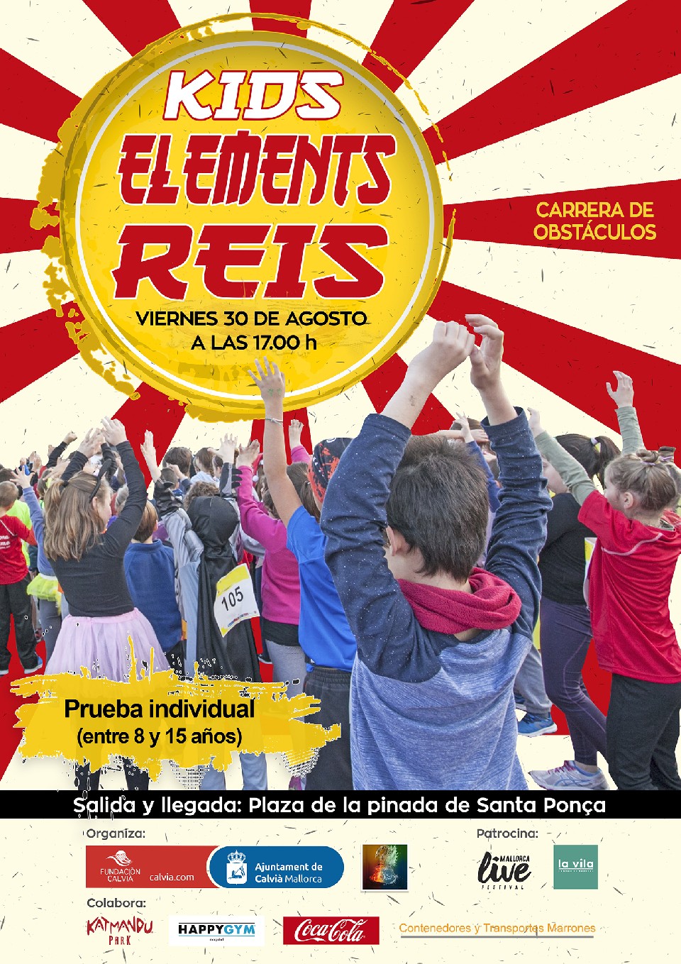 Carrera de obstáculos individual para niños y niñas entre 8 y 15 años. Las personas participantes se enfrentarán a un mínimo de 5 estaciones en las que deberán hacer frente a obstáculos, reptar, pasar circuitos de habilidad, cargar pesos acordes a su edad, etc. El recorrido de aproximadamente 1 km de distancia transcurre entre la plaza de la pinada de Santa Ponça, la playa de Santa Ponça, la pinada de Santa Ponça, un tramo de la c/ Jaume I y llegada de nuevo en la Plaza de la Pinada.