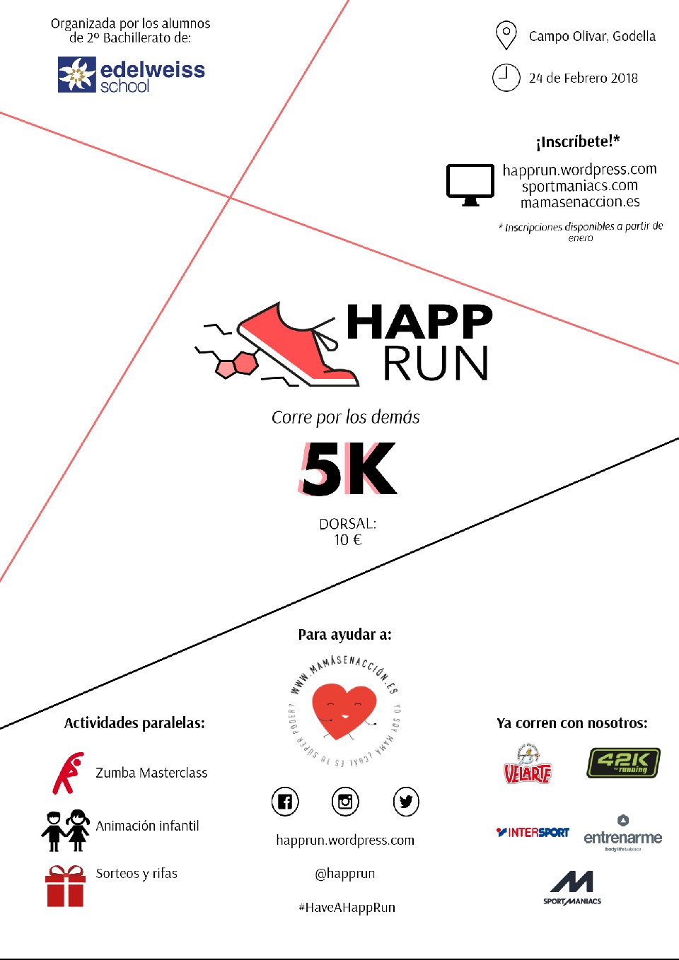 El sábado 24 de febrero de 2018, a las 09:30h, se celebrará la I Carrera Solidaria Happrun, promovida y organizada por los alumnos de 2º Bachillerato de Edelweiss-School, cuyas ganancias serán destinadas a la asociación “Mamás en acción”.