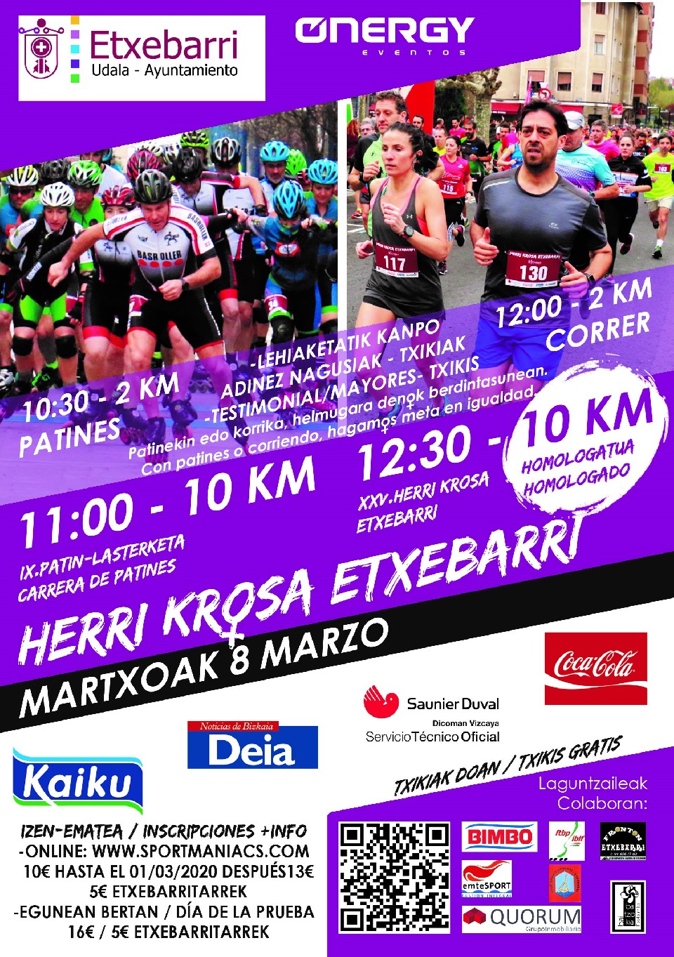 - 11:00 IX Carrera de patines 10 km - Inscripción online (10€ hasta el 01/03/2020, 13€ hasta el 07/03/2020 a las 15:00, 5€ para los corredores empadronados en Etxebarri) y presencial el día de la carrera (5€ para los empadronados en Etxebarri y 16€ para el resto).