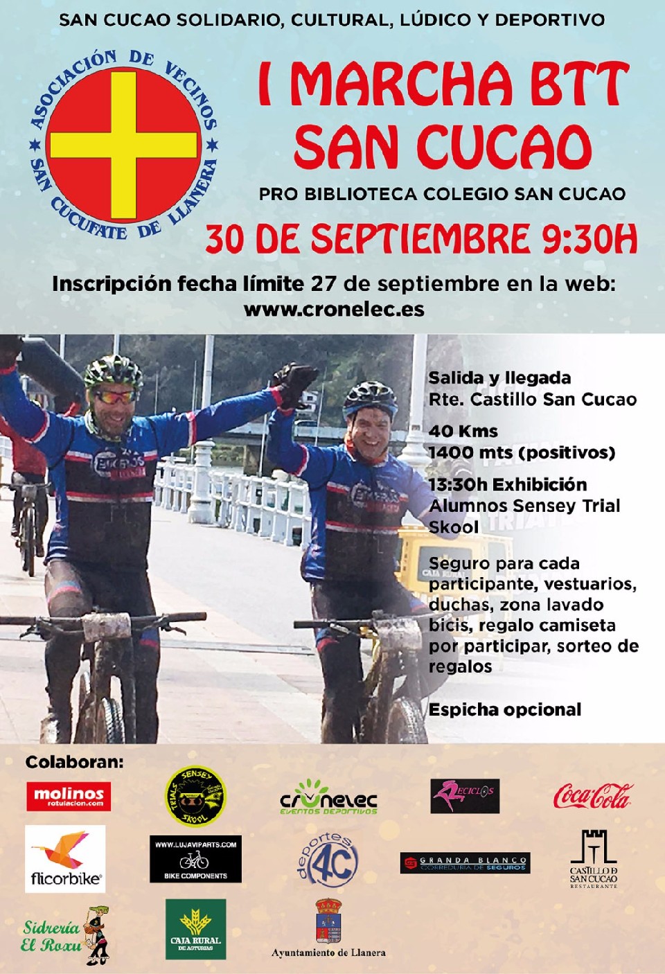 La Asociación de Vecinos de San Cucufate organiza la I Marcha BTT San Cucao, con la colaboración del Excelentísimo Ayuntamiento de Llanera. La marcha tendrá su salida el domingo día 30 de Septiembre de 2018 a las 9:30 horas desde el Castillo de San Cucao.