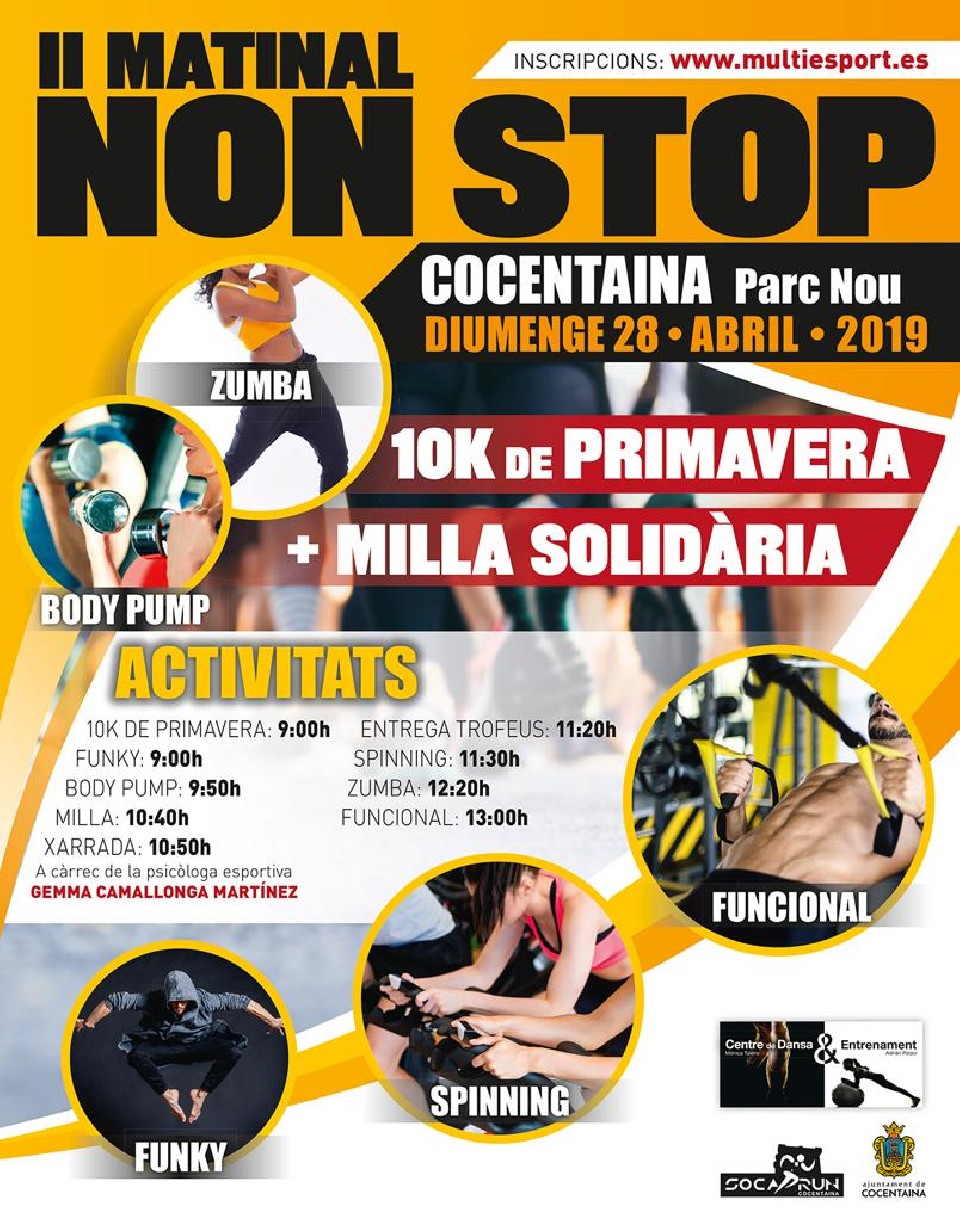 El “II MATINAL NON STOP” 10K DE PRIMAVERA se celebrará el próximo domingo dia 28 de abril de 2019 a las 9:00h, desde el Centre de Dansa i Entrenament “Monica Talens i Adrián Palací, ubicado en la Calle Almudaina s/n. En este evento podrá participar cualquier persona sin distinción de sexo o nacionalidad. El horario y las actividades que se realizarán son las siguientes: