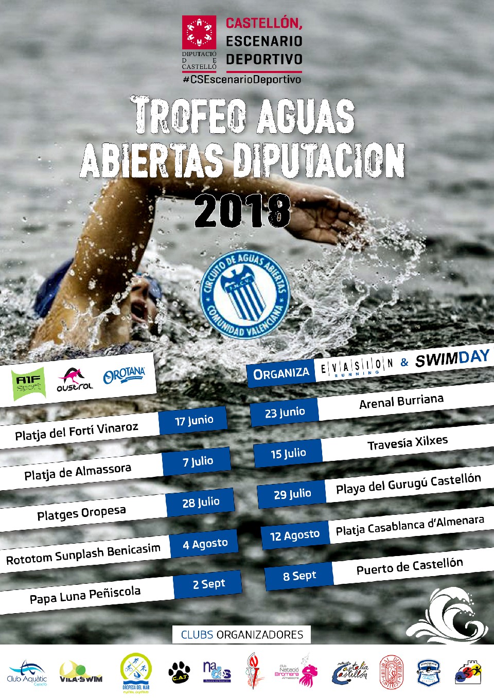 Evasion Running de Castellón organiza con el patrocinio de la Diputación Provincial de Castellón el II TROFEO DIPUTACION AGUAS ABIERTAS junto con los clubes responsables de éste trofeos que son, Club Natació Bromera Almassora, Club Natación Castalia Castellón, Escuela de Natación Nados, Club Vila-Swim, Masters Natación Evasion, Club Natación la Vall, Club Natació Vinaròs, Club Almenara Triatló, Cultural Deportiva y Triatlon Peñiscola para la temporada 2018.