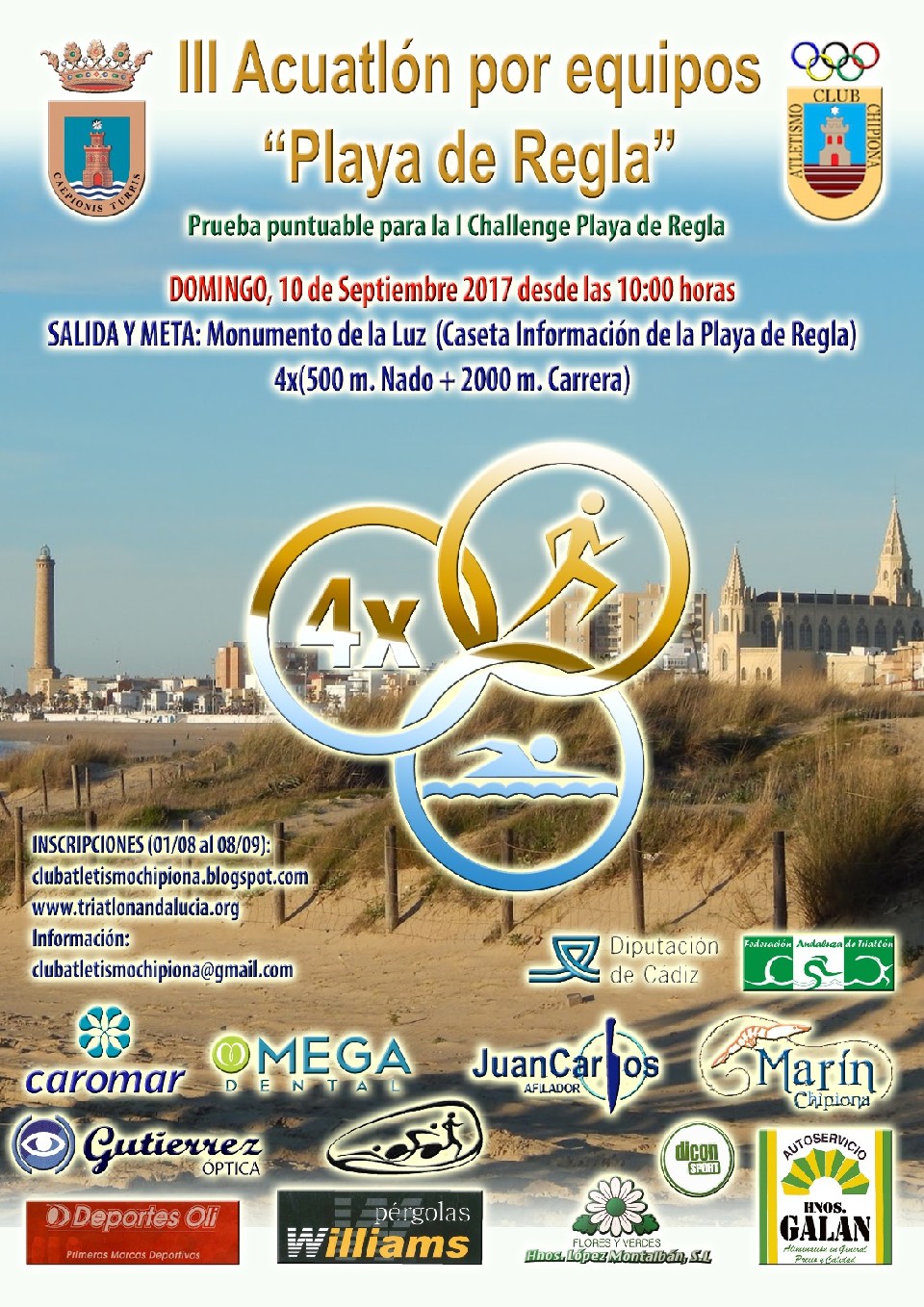 Sailkapenak 4 FEDERADOS 10/09/2017 10:00 Sailkapenak egiteke 4 NO FEDERADOS 10/09/2017 10:00 Sailkapenak egiteke 3 FEDERADOS + 1 NO FEDERADO 10/09/2017 10:00 Sailkapenak egiteke 2 FEDERADOS + 2 NO FEDERADOS 10/09/2017 10:00 Sailkapenak egiteke 1 FEDERADO + 3 NO FEDERADOS 10/09/2017 10:00 Sailkapenak egiteke Kontaktuaren informazioa Antolatzailearekin harremanetan jarri – 639616571 Araudia http://www.triatlonandalucia.org/competiciones/iii-acuatl%C3%B3n-por-equipos-playa-de-regla