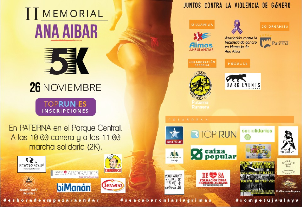 - AMBULANCIAS AIMOS S.L. ORGANIZA EN REPRESENTACION DE LA ASOCIACION CONTRA LA VIOLENCIA DE GENERO DE PATERNA EN MEMORIA DE ANA AIBAR- LA CARRERA POPULAR PATERNA CONTRA LA VIOLENCIA DE GENERO “III MEMORIAL ANA AIBAR”.