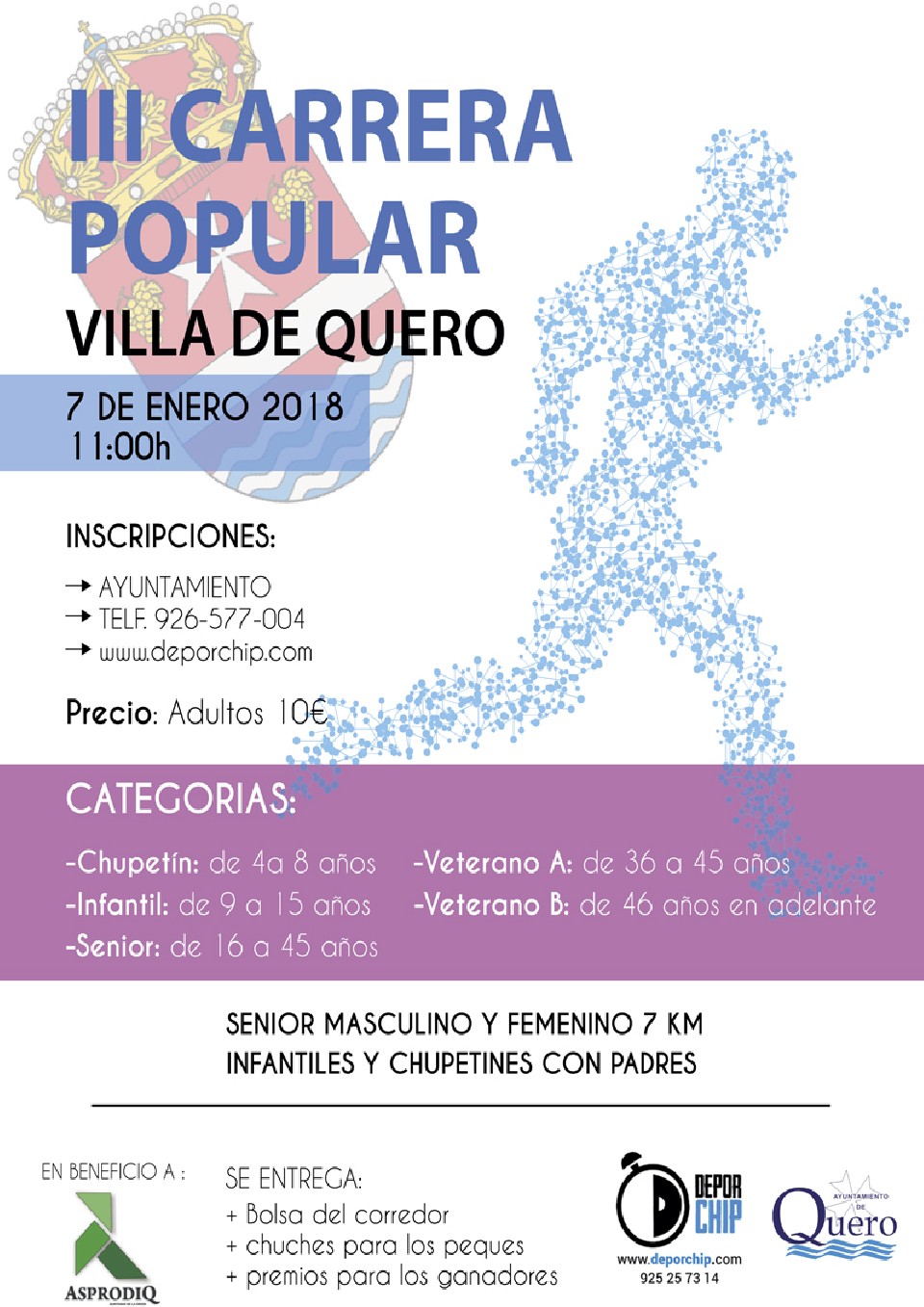Sailkapenak CAT SEN - VET A - VET B - Cierre de Inscripciones 05/01/2018 - 12:00 de la mañana 07/01/2018 12:00 7km Sailkapenak egiteke DORSAL 0 en beneficio de la Asociación ASPRODIQ. Sailkapenak egiteke Kontaktuaren informazioa Antolatzailearekin harremanetan jarri – Araudia http://www.deporchip.com/eventos/pruebas2018/quero18/reglamento.pdf