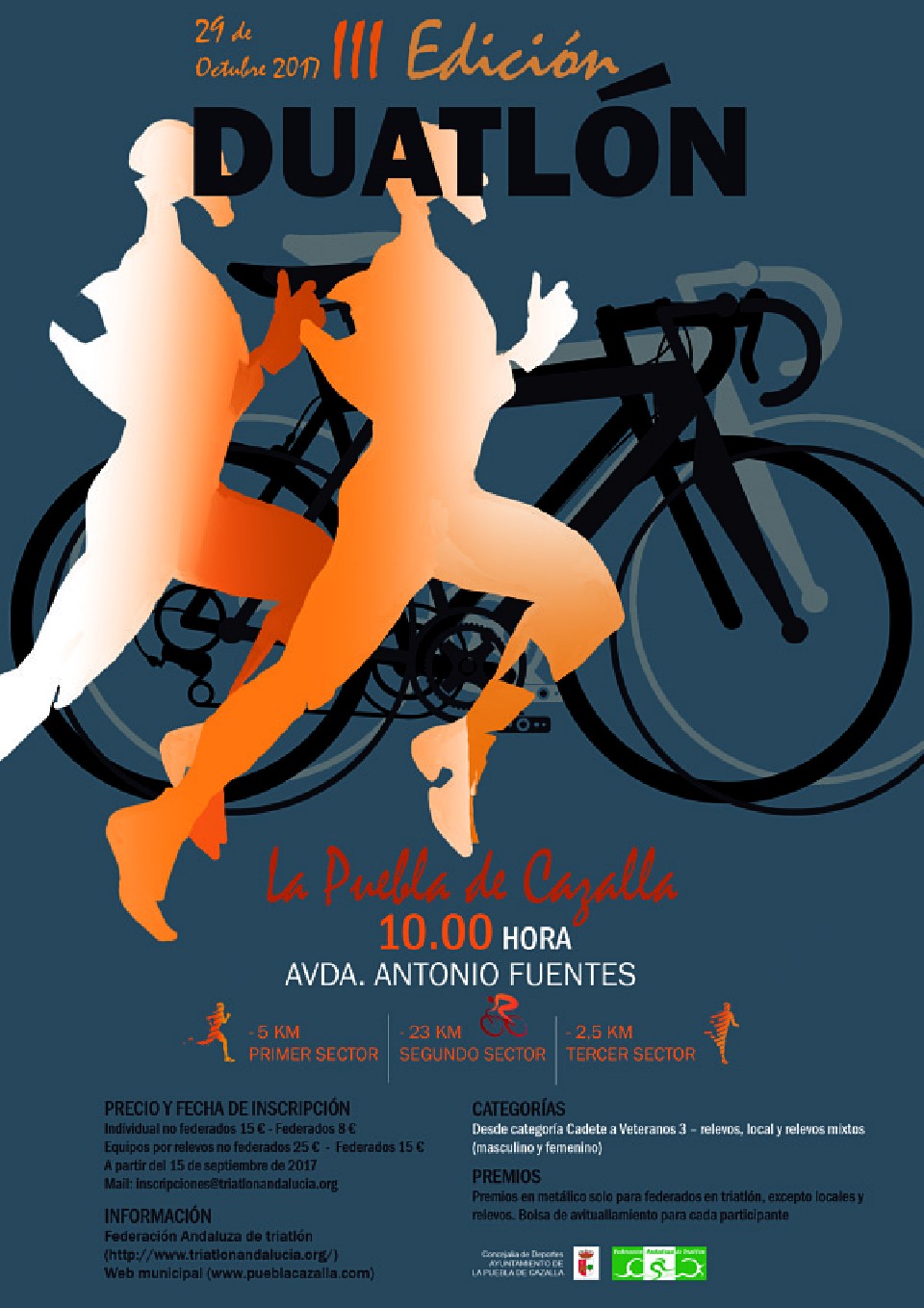 Sailkapenak FEDERADOS 29/10/2017 10:00 Sailkapenak egiteke NO FEDERADOS 29/10/2017 10:00 Sailkapenak egiteke RELEVOS 29/10/2017 10:00 Sailkapenak egiteke Kontaktuaren informazioa Antolatzailearekin harremanetan jarri – 639616571 Araudia http://www.triatlonandalucia.org/competiciones/iii-duatl%C3%B3n-la-puebla-de-cazalla