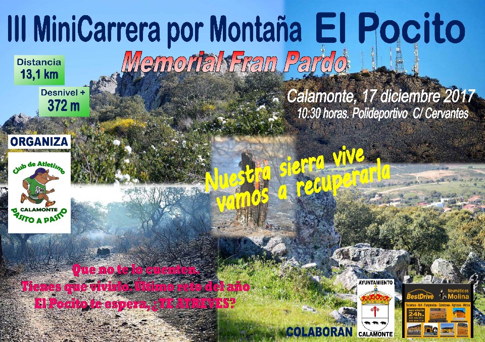En años anteriores esta prueba era paralela a la carrera oficial “EL POCITO”. Debido al fuego que ha afectado a gran parte del recorrido de la carrera oficial, nos hemos visto en la necesidad de suspender la misma por seguridad hacía los corredores. No obstante y ante la buena acogida y aceptación que han tenido ambas pruebas a nivel autonómico y en pro de reivindicación con lo sucedido, hemos decidido realizar esta prueba paralela (MINI) que discurre por una pequeña parte de la zona quemada, para por una parte concienciar de lo sucedido y ver “in situ” los corredores el alcance de los hechos, y por otra parte para no privar a los corredores de esta interesante y gran prueba.