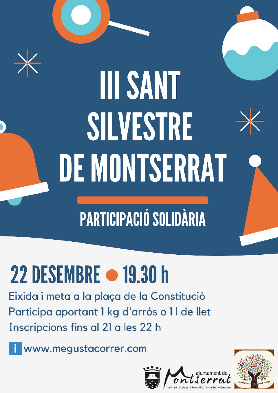 El Ayuntamiento de Montserrat y Megustacorrer organizan la San Silvestre. Prueba a la que tendrá acceso cualquier deportista sin distinción de sexo o nacionalidad.