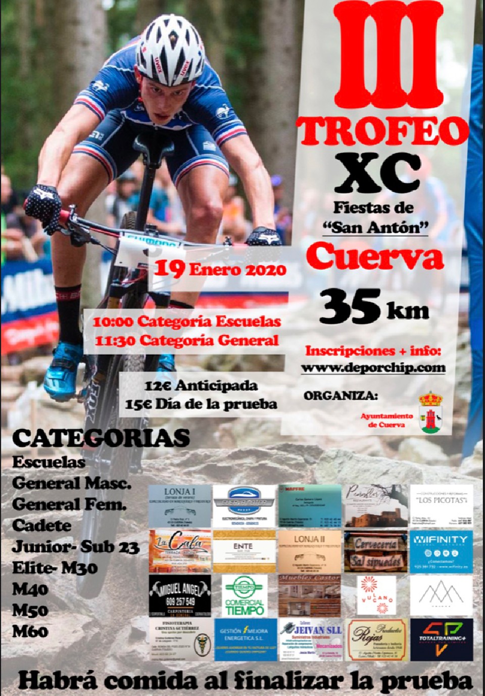 Sailkapenak APLAZADA PENDIENTE DE FECHA 19/01/2020 11:30 35km Sailkapenak egiteke Kontaktuaren informazioa Antolatzailearekin harremanetan jarri – Araudia http://www.deporchip.com/eventos/pruebas2020/bttxccuerva20/reglamento.pdf