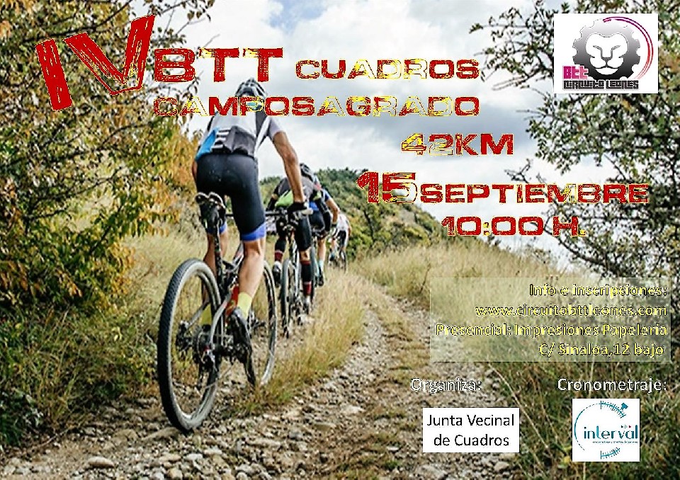 L A P R U E B A “ I V B T T CUADROS CAMPOSAGRADO ” E S L A 5ª D E L A S 6 P R U E B A S E N L Í N E A P U N T U A B L E S P A R A E L “ I V C I R C U I T O B T T L E O N É S ” Y T E N D R Á L U G A R E L P R Ó X I M O 15 D E SEPTIEMBRE D E 2 0 1 9 A P A R T I R D E L A S 1 0 : 0 0 H C O N S A L I D A Y M E T A E N L A L O C A L I D A D D E CUADROS .C O N S T A R Á D E U N