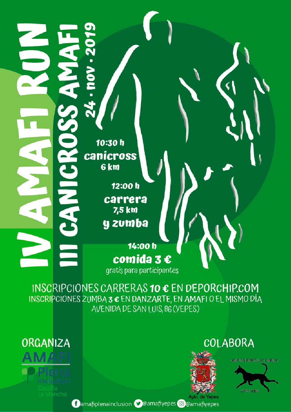 Sailkapenak CANICROSS MAS Y FEM 24/11/2019 10:30 6km Sailkapenak ikusi CARRERA POPULAR MASC Y FEM 24/11/2019 12:00 7.5km Sailkapenak ikusi Kontaktuaren informazioa Antolatzailearekin harremanetan jarri – Araudia http://www.deporchip.com/eventos/pruebas2019/amafiyepes19/reglamento.pdf