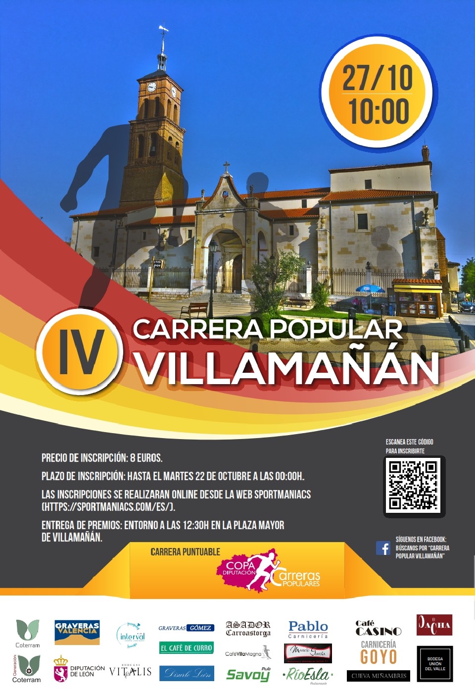 La IV Carrera Popular de Villamañan se disputara el Domingo 27 de Octubre y estará organizada por el Ayuntamiento de Villamañan a través de su Concejalía de Deportes, será carrera puntuable para la IX Copa Diputación de Carreras Populares.