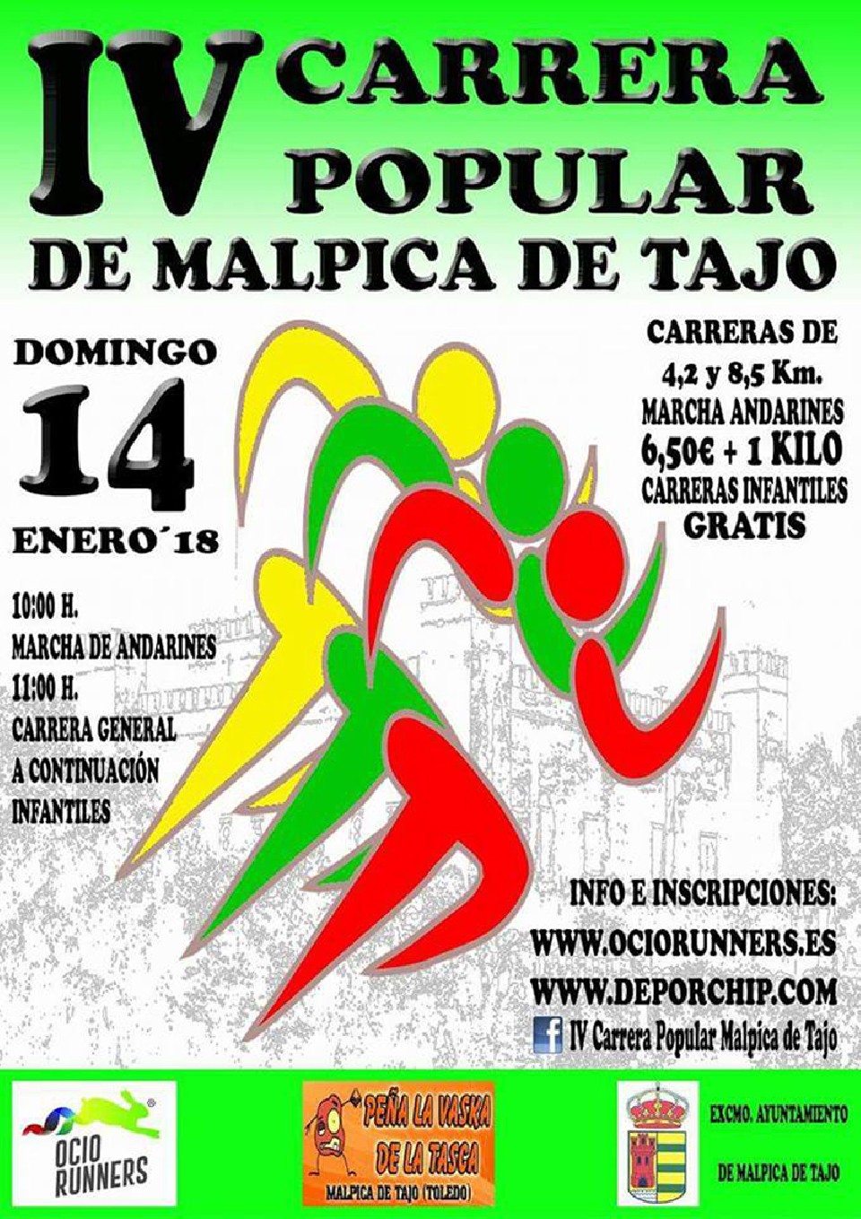 Sailkapenak GENERAL 8.5K 14/01/2018 11:00 8.5km Sailkapenak ikusi GENERAL 4.25K 14/01/2018 11:00 4.2km Sailkapenak ikusi CADETE 4.25K 14/01/2018 11:00 4.2km Sailkapenak ikusi MARCHA ANDARINES - 4,2K- Cierre de Inscripciones 12/01/2018 - 12:00 14/01/2018 10:00 4.2km Sailkapenak egiteke Kontaktuaren informazioa Antolatzailearekin harremanetan jarri – Araudia http://deporchip.com/eventos/pruebas2018/malpicatajo18/reglamento.pdf