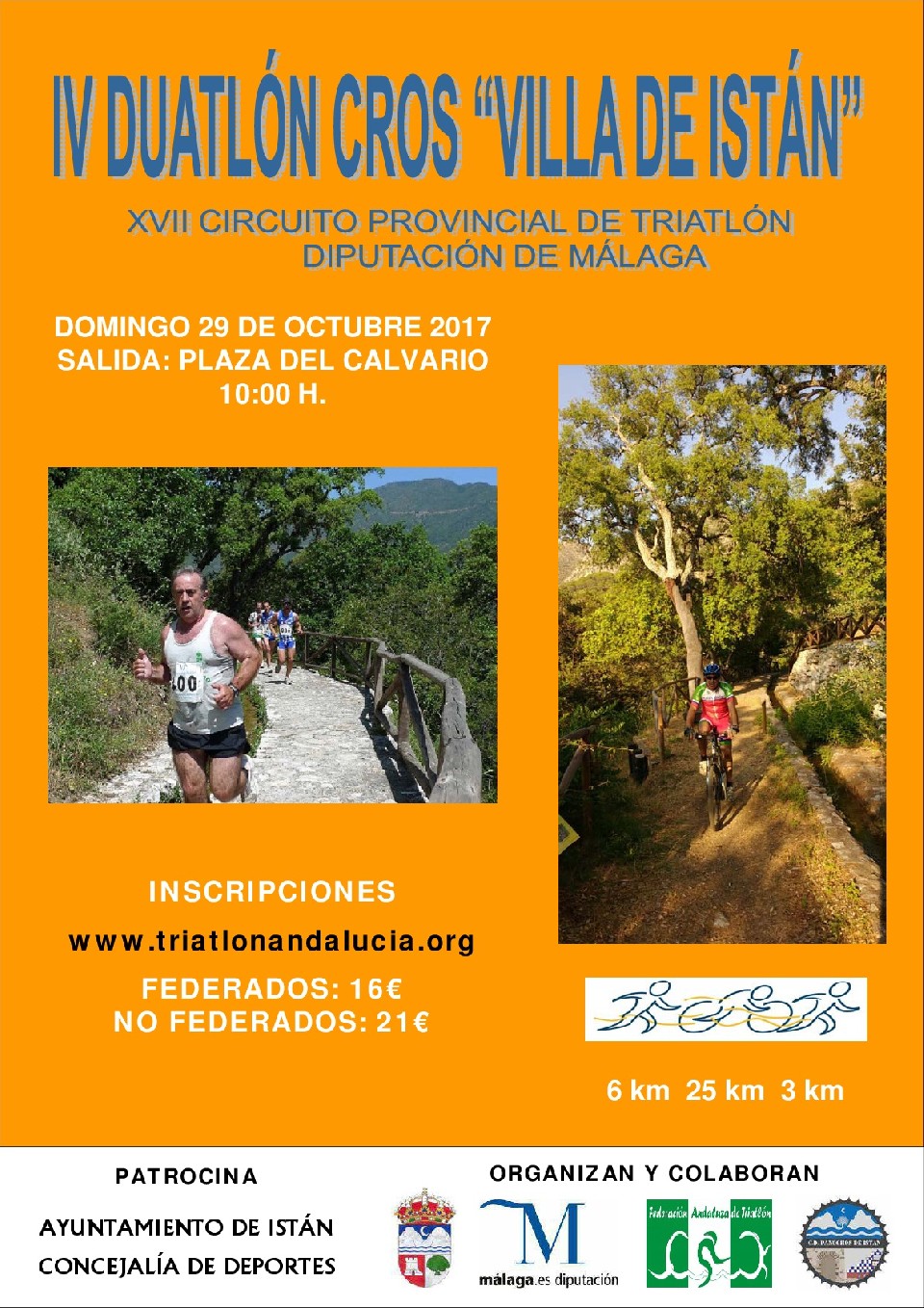 Sailkapenak MASCULINOS 29/10/2017 10:00 34km Sailkapenak ikusi FEMENINAS 29/10/2017 10:00 34km Sailkapenak ikusi FEDERADOS 29/10/2017 10:00 29km Sailkapenak egiteke NO FEDERADOS 29/10/2017 10:00 29km Sailkapenak egiteke Kontaktuaren informazioa Antolatzailearekin harremanetan jarri – 639616571 Araudia http://www.triatlonandalucia.org/competiciones/iv-duatl%C3%B3n-cros-villa-de-ist%C3%A1n