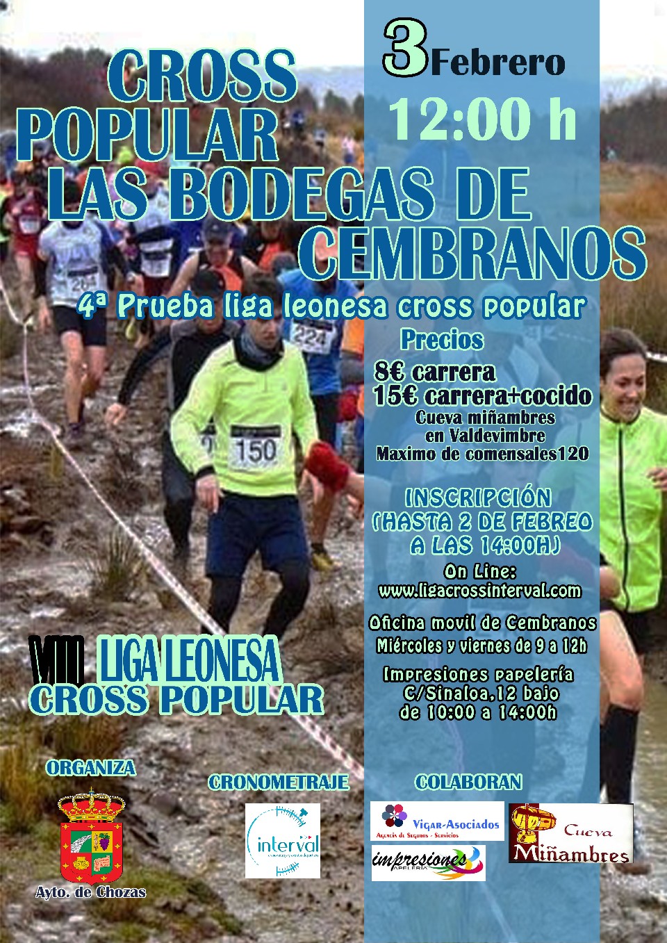 La inscripción para la prueba tendrá un precio de 8 € y se puede hacer ON-LINE en www. http:www.ligacrossinterval.com/ y presencialmente en la oficina móvil que el Ayuntamiento de Chozas tiene en Cembranos y en la Papelería Impresiones (calle de Sinaloa, 12; bajo, en la zona de Eras de Renueva) hasta el día 2 de febrero a las 14:00 horas.