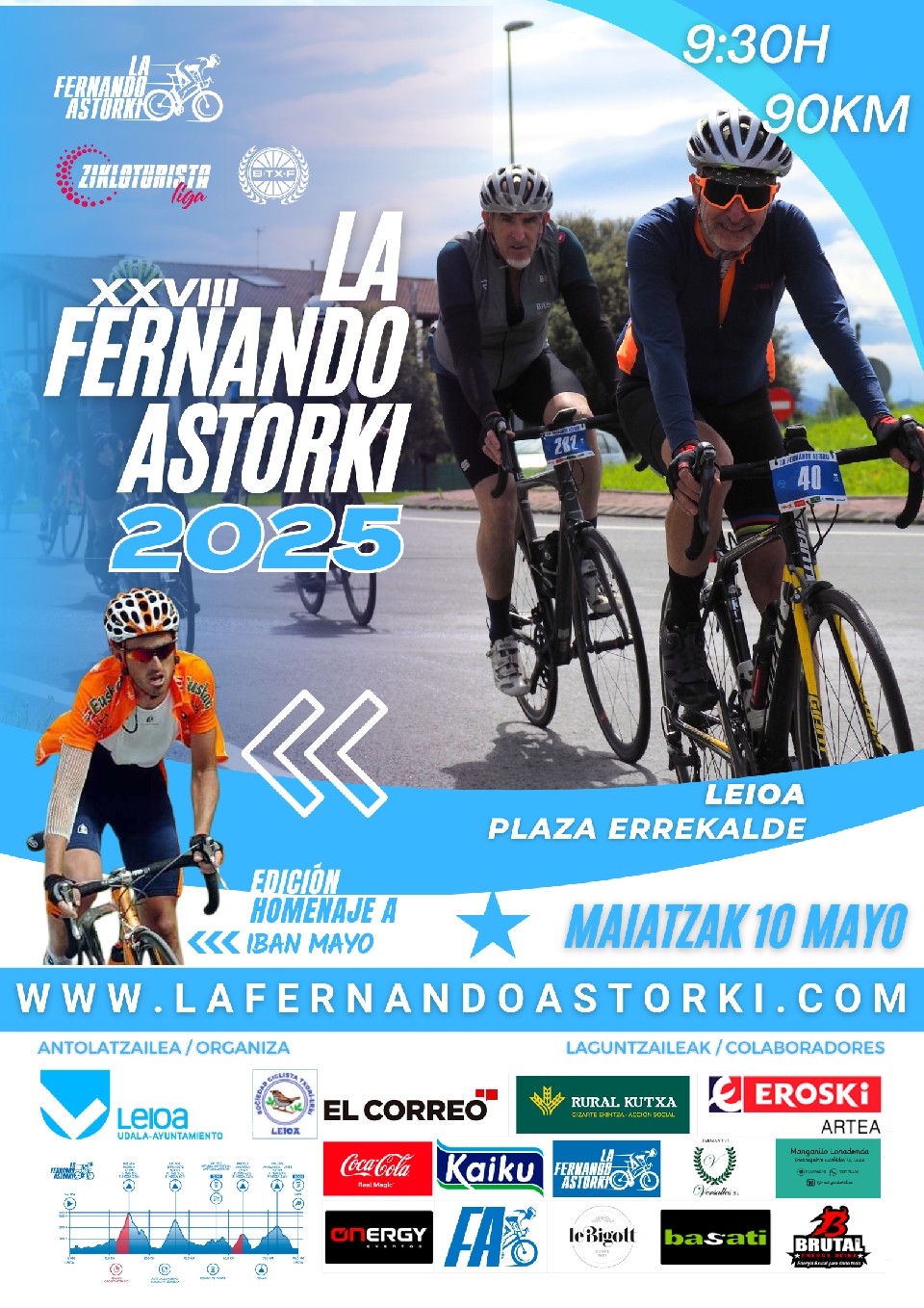 La XXVIII edición de la FERNANDO ASTORKI tendrá como hora de salida oficial las 09:30 horas del sábado 10 de mayo de 2025 en Errekalde Plaza de Leioa. El recorrido consta de 90 Km. Y finalizará en el mismo lugar de la salida.