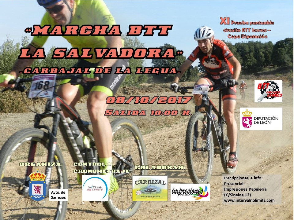 1.1PLAZO E INSCRIPCIÓN: Hasta el 06 de Octubre de 2017 a las 14:00h. (Tanto presenciales como a través de plataforma) 1.2 CÓMO INSCRIBIRSE: De manera presencial en Impresiones Papelería (Calle Sinaloa 12, León. Tfno 987 08 60 99) en horario comercial. A través de las páginas www.circuitobttleones.com www.intervalnolimits.com pinchando sobre “EVENTO” “MARCHA BTT LA SALVADORA ” . 1.2 INSCRIPCION EQUIPOS: Al realizar la inscripción aquellos participantes que quieran formar parte de un equipo habrán de reflejarlo en la inscripción o indicarlo verbalmente si la inscripción es presencial, también si se trata de un equipo inscrito en el “I I Circuito Leonés BTT-COPA DIPUTACIÓN” indicando el nombre del equipo al que pertenecen. 1.3 PRECIO: La inscripción a la prueba tendrá un coste de 18 €. 1.4 SERVICIOS INCLUIDOS EN LA INSCRIPCIÓN: - Seguro deportivo de accidentes - Seguro R.C durante la prueba - Servicios sanitarios - Cronometraje y control de la prueba mediante Chip - Avituallamientos (2 en recorrido más meta) Líquidos y sólidos - “Bolsa Biker” con bebida Isotónica y Barrita energética * Es criterio imprescindible para poder tomar parte e inscribirse tanto en el “II Circuito Leonés BTT-COPA DIPUTACIÓN” como en la “MARCHA BTT LA SALVADORA” tener los 18 años cumplidos el día de realizar la inscripción.