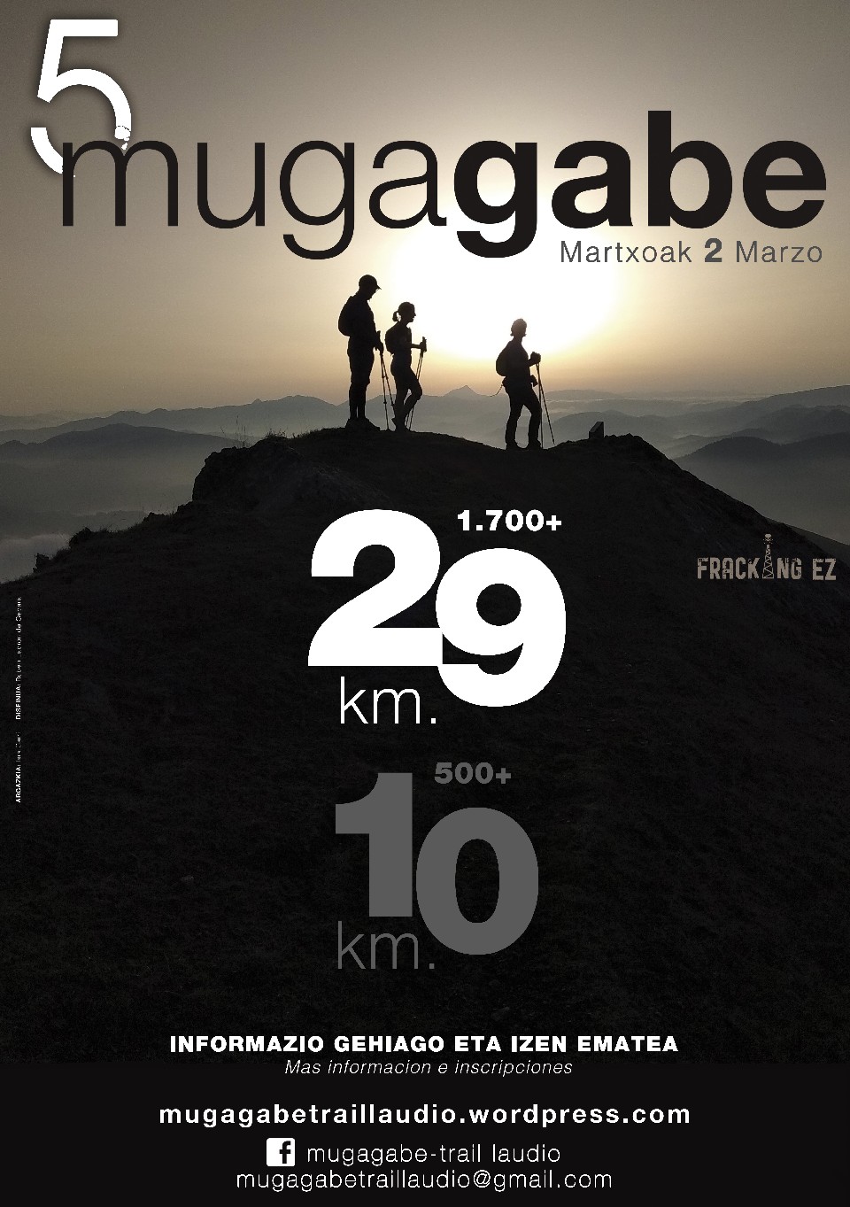 • Los participantes de la Mugagabe-trail Laudio en ambas distancias, entienden que participan voluntariamente y bajo su propia responsabilidad en la competición. Por consiguiente, renuncian, exoneran, eximen y convienen en no denunciar a la entidad organizadora, persona física organizadora, colaboradores, patrocinadores y otros participantes, de toda responsabilidad civil para con los corredores y sus herederos. Firman y aceptan este documento de descargo.