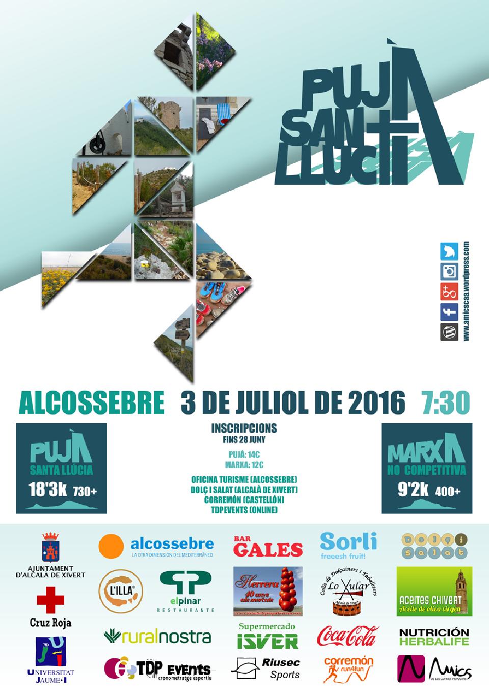 La V Pujà a Santa Llúcia de Alcossebre se celebrará el 3 de julio de 2016 con un recorrido de 18’3 Km con 730 m de desnivel positivo. El itinerario estará marcado convenientemente por la organización. El tiempo máximo estimado para cubrir la prueba será de 4 horas.