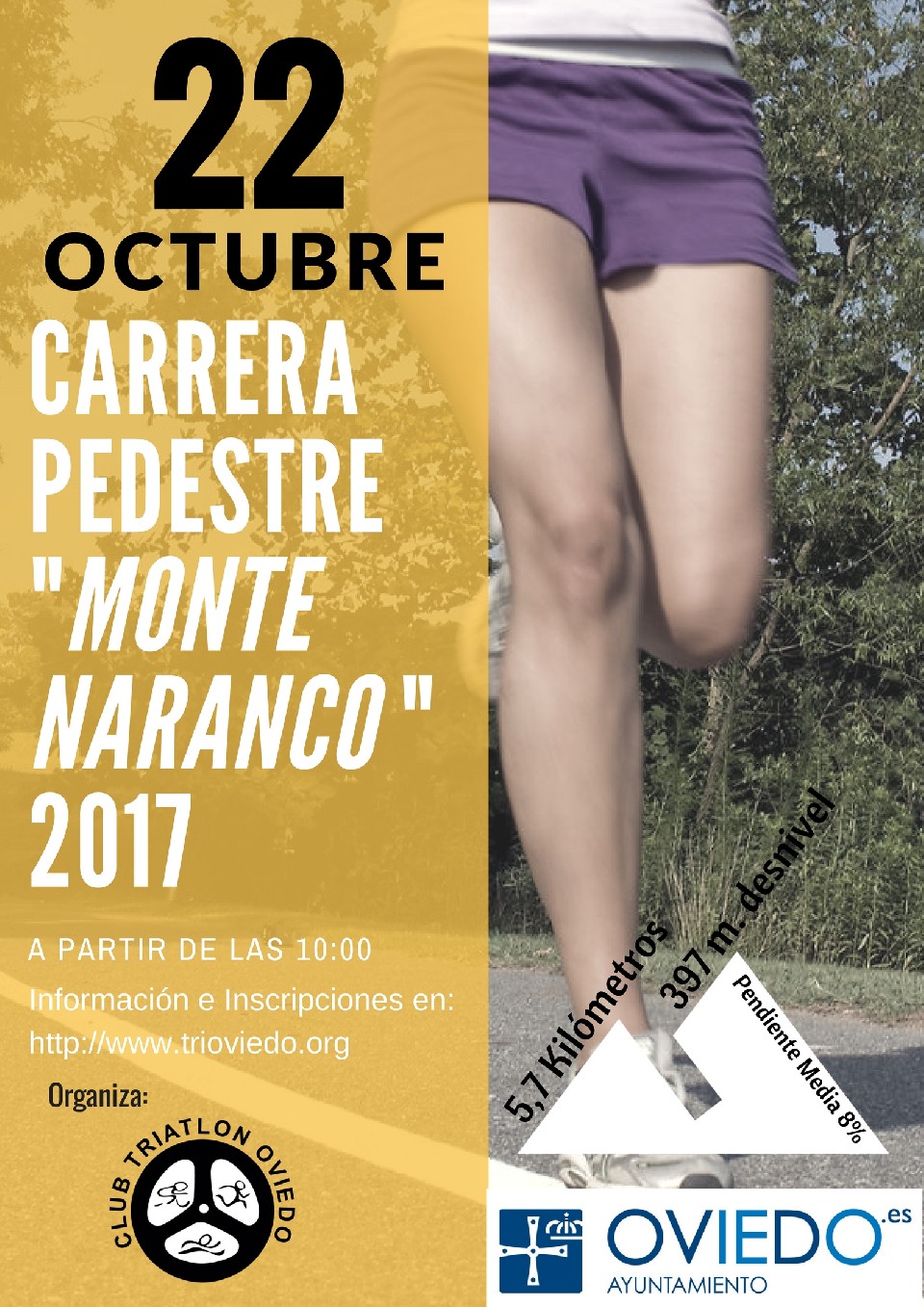 El CLUB TRIATLON OVIEDO organiza la carrera pedestre “Subida El Naranco” el domingo 22 de octubre de 2017. La prueba tendrá su salida a las 10:00 horas desde la Losa de la Estación ferroviaria de Oviedo y la llegada en el aparcamiento del alto de El Naranco.