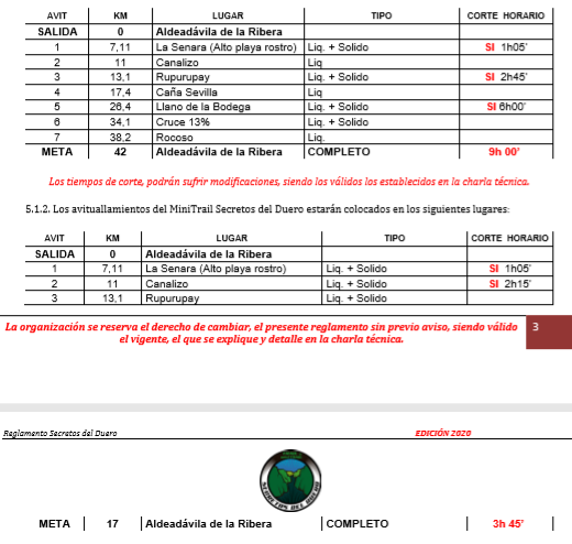 3.2. Tanto el Trail Secretos del Duero, como el MiniTrail Secretos del Duero, tendrán carácter de semiautosuficiencia, por lo que los corredores se les recomienda, llevar un mínimo de alimentación, bebida y material.
