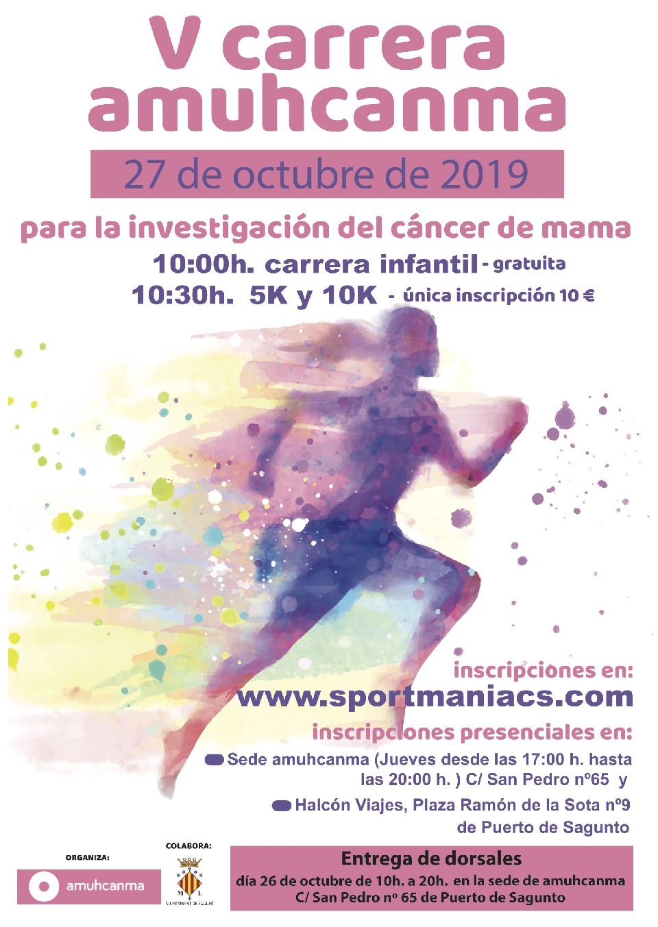 Artículo 1º. La Asociación de Mujeres y Hombres afectados Cáncer de Mama –AMUHCANMA- junto con la colaboración del Ayuntamiento de Sagunto y el patrocinio de diversas entidades y empresas locales organiza el quinto “5K y 10K AMUHCANMA”, prueba atlética en la que podrán participar todas las personas que lo deseen, debidamente inscritas y mayores de 16 años para el 10k, y también menores a partir de 8 años solo en el 5k y debidamente acompañados de sus padres.