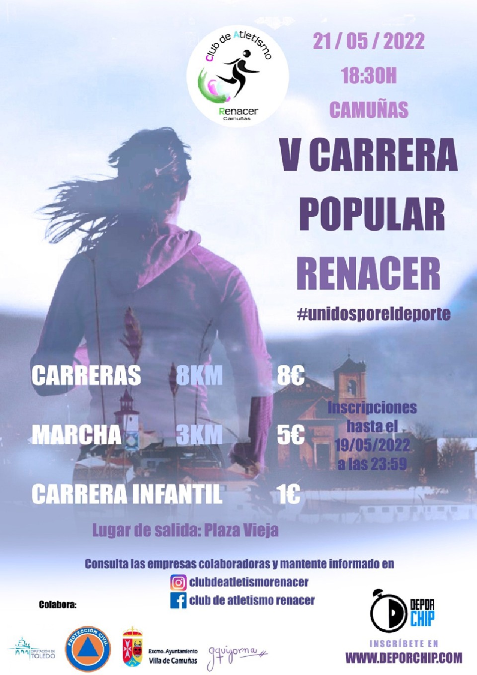 Sailkapenak GENERAL 8Km 21/05/2022 20:30 8km Sailkapenak ikusi GENERAL MARCHA 3KM 21/05/2022 20:15 3km Sailkapenak egiteke MENORES 21/05/2022 18:30 Sailkapenak egiteke Kontaktuaren informazioa Antolatzailearekin harremanetan jarri – Araudia https://www.deporchip.com/eventos/pruebas2022/camunas22/reglamento.pdf