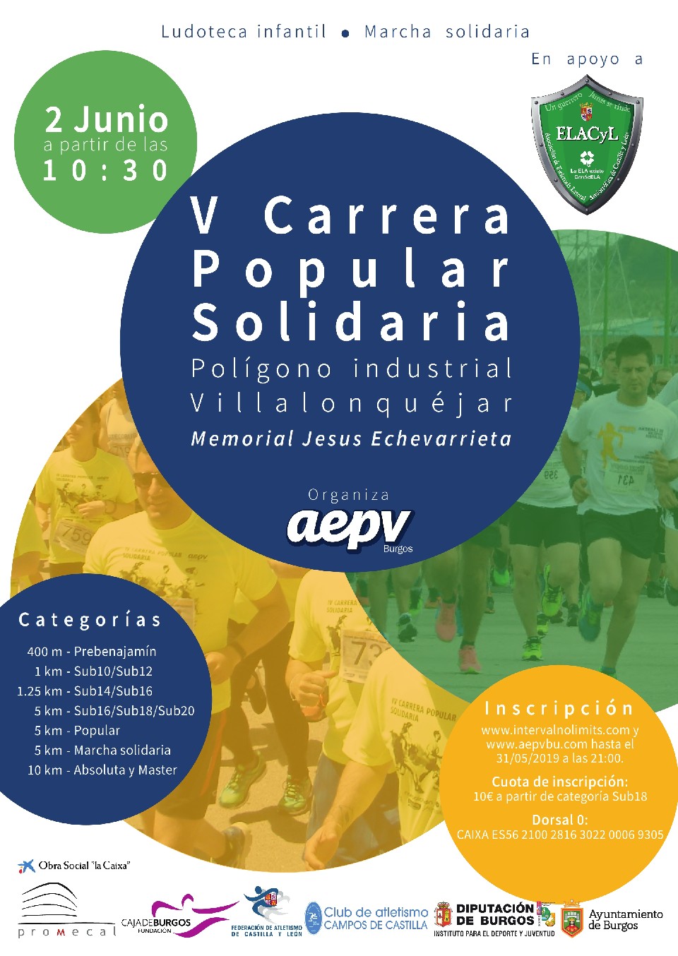 Art. 1.- La Asociación de Empresarios del Polígono de Villalonquéjar, AEPV, con la colaboración técnica del Club Deportivo Campos de Castilla – Universidad de Burgos, organiza la V CARRERA POPULAR SOLIDARIA POLÍGONO INDUSTRIAL VILLALONQUÉJAR “MEMORIAL JESUS ECHEVARRIETA”, que se celebrará en Burgos el domingo día 2 junio de 2019, en el Polígono Industrial de Villalonquéjar, dando comienzo la misma a las 10.30 h.