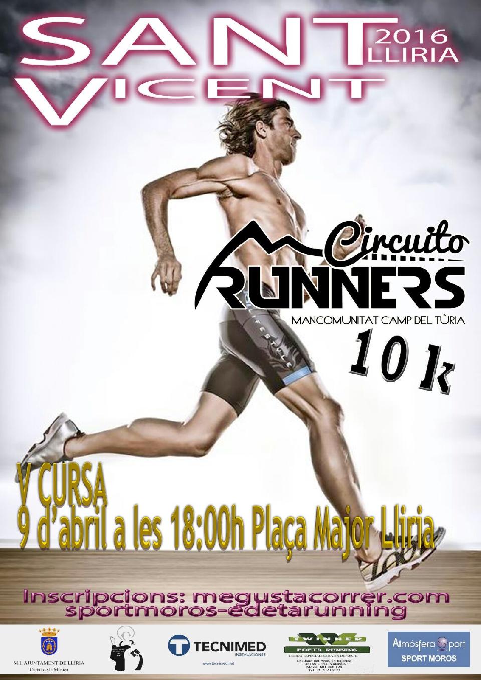Articulo 1º La Clavaría y Mayoralía de San Vicente de Llíria organiza, en colaboración con la Concejalía de Deportes del Ayuntamiento de Llíria, la Mancomunitat Camp de Túria y el asesoramiento técnico de Píndaro Esports, la V Cursa Popular a Sant Vicent. Esta carrera se celebrará el sábado 09 de abril del 2016. Prueba sin distinción de sexo, raza o religión y donde pueden participar todos los atletas federados o no. Prueba puntuable para el Gran Premio Mancomunitat “Camp de Túria” 2016.
