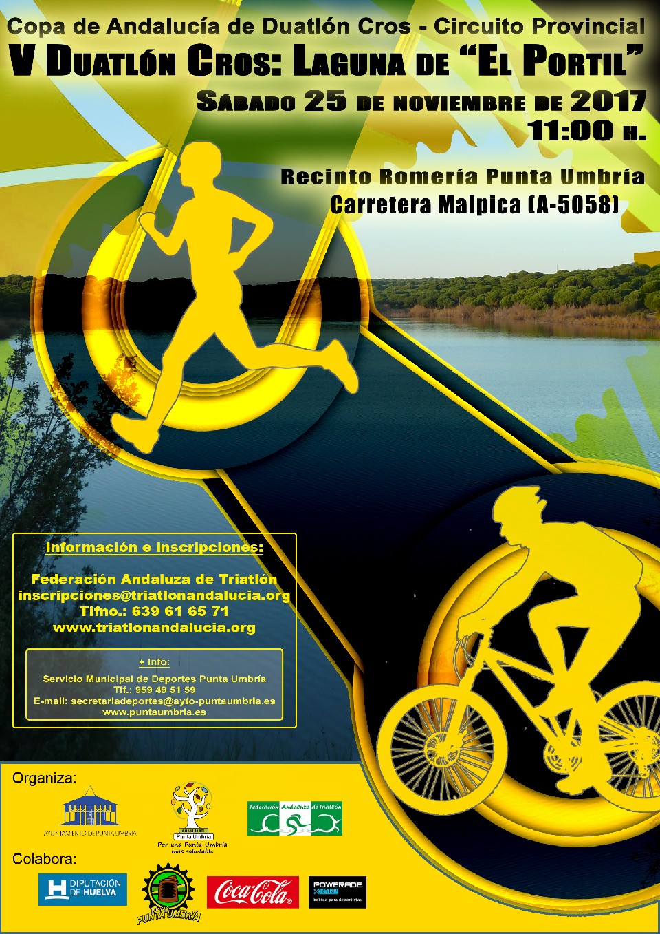 Sailkapenak MASCULINOS 25/11/2017 11:00 30km Sailkapenak ikusi FEMENINAS 25/11/2017 11:10 30km Sailkapenak ikusi FEDERADOS 25/11/2017 11:00 30km Sailkapenak egiteke NO FEDERADOS 29km Sailkapenak egiteke Kontaktuaren informazioa Antolatzailearekin harremanetan jarri – 639616571 Araudia http://www.triatlonandalucia.org/competiciones/v-duatl%C3%B3n-cros-laguna-de-el-portil-punta-umbr%C3%ADa