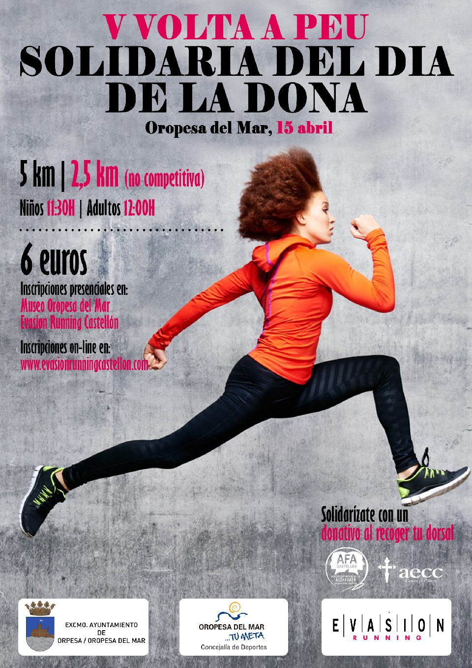 El Excelentísimo Ayuntamiento de Oropesa del Mar organiza con el asesoramiento técnico de Evasion Running Castellón y la colaboración de la Asociación del Cáncer y Alzheimer de Oropesa, la V VOLTA SOLIDARIA DEL DIA DE LA DONA, prueba atlética en la que podrán participar todas las personas que lo deseen, debidamente inscritas, nacidas hasta 2006. Con esto queremos ofrecer a todos/as los ciudadanos de Oropesa y proximidades la posibilidad de participar y disfrutar del running en esencia pura, para que todos/as sin distinción de sexo, edad, y nivel deportivo podamos salir a la calle a hacer lo que más nos gusta “CORRER” y así hacer aún más grande si cabe la práctica del Atletismo y fomentar la vida saludable y deportiva.