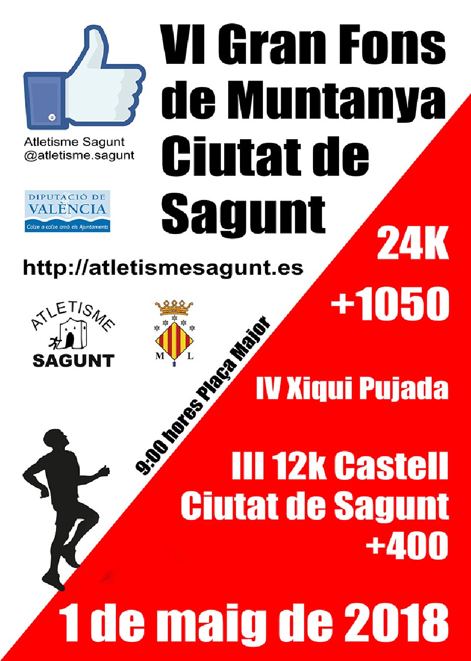 Atletisme Sagunt (G98645666) organiza el VI Gran Fons de Muntanya Ciutat de Sagunt y el III 12km Castell Ciutat de Sagunt (en adelante Gran Fons y 12km), que tendrán lugar el martes 1 de mayo del 2018 con salida a las 9:00 horas para ambas carreras. Estas pruebas discurrirán en su mayor parte por senderos y pistas de montaña y tendrán carácter competitivo, con control de tiempos (Gran Fons), clasificaciones y trofeos en diferentes categorías.