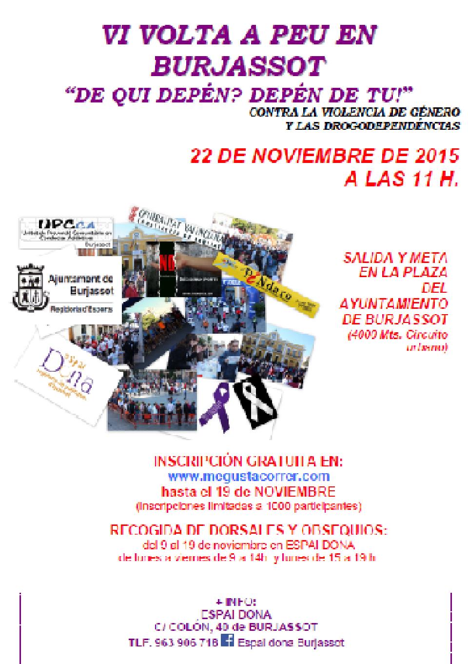 1a. Espai Dona, Regidoria de Polítiques d'Igualtat, la Unitat de Prevenció Comunitària en Conductes Addictives i la Regidoria d’Esports de l'Ajuntament de Burjassot ha organitzat la VI Volta a Peu a Burjassot contra la Violència de Gènere i les Drogodependències «De qui depén? Depén de tu!», amb la col.laboració de Pindaro Esports, una activitat esportiva, reivindicativa i de caràcter solidari que consistirà en una única prova de caràcter popular sense categories establides.