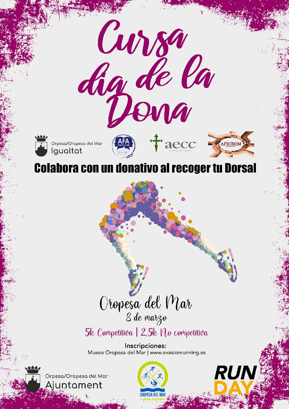 El Excelentísimo Ayuntamiento de Oropesa del Mar organiza con el asesoramiento técnico de Runday la VII VOLTA SOLIDARIA DEL DIA DE LA DONA, prueba atlética en la que podrán participar todas las personas que lo deseen, debidamente inscritas, nacidas hasta 2008. Con esto queremos ofrecer a todos/as los ciudadanos de Oropesa y proximidades la posibilidad de participar y disfrutar del running en esencia pura, para que todos/as sin distinción de sexo, edad, y nivel deportivo podamos salir a la calle a hacer lo que más nos gusta “CORRER” y así hacer aún más grande si cabe la práctica del Atletismo y fomentar la vida saludable y deportiva.