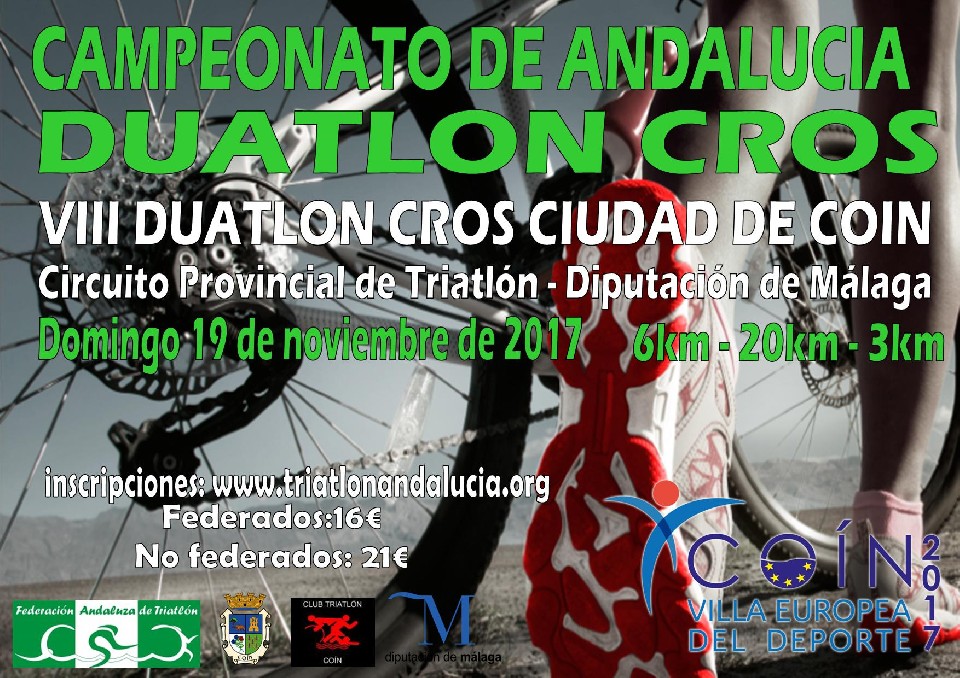 Sailkapenak FEDERADOS 19/11/2017 10:00 29km Sailkapenak ikusi FEDERADAS 19/11/2017 10:02 29km Sailkapenak ikusi NO FEDERADOS 19/11/2017 10:06 29km Sailkapenak ikusi NO FEDERADAS 19/11/2017 10:02 29km Sailkapenak ikusi Kontaktuaren informazioa Antolatzailearekin harremanetan jarri – 639616571 Araudia http://www.triatlonandalucia.org/competiciones/viii-duatl%C3%B3n-cros-ciudad-de-co%C3%ADn