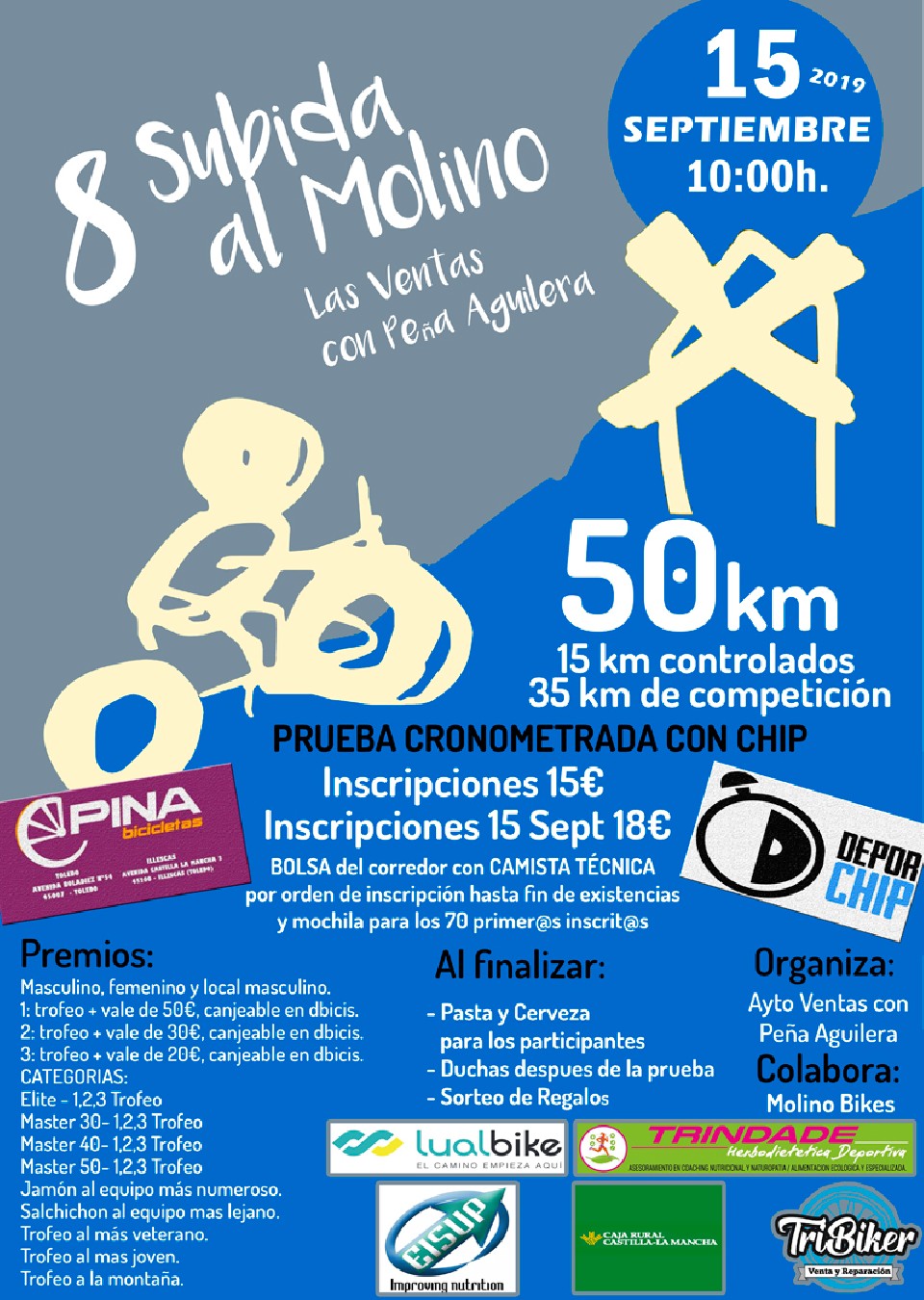Sailkapenak TODAS LAS CATEGORÍAS - Cierre de inscripciones 13/09/2019 - Hasta las 10:00h AM 15/09/2019 10:00 50km Sailkapenak ikusi Kontaktuaren informazioa Antolatzailearekin harremanetan jarri – Araudia http://www.deporchip.com/eventos/pruebas2019/bttventasmolino19/reglamento.pdf