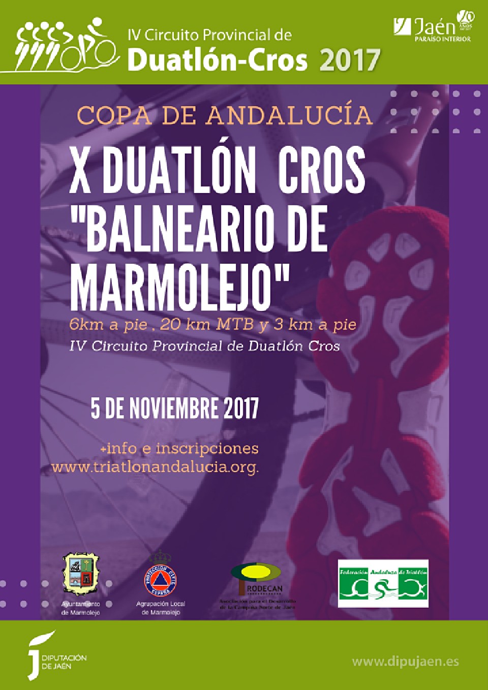 Sailkapenak MASCULINOS 05/11/2017 10:30 29km Sailkapenak ikusi FEMENINAS 05/11/2017 10:40 29km Sailkapenak ikusi FEDERADOS 05/11/2017 10:30 29km Sailkapenak egiteke NO FEDERADOS 05/11/2017 10:30 29km Sailkapenak egiteke Kontaktuaren informazioa Antolatzailearekin harremanetan jarri – 639 616 571 Araudia http://www.triatlonandalucia.org/competiciones/x-duatl%C3%B3n-cros-balneario-de-marmolejo