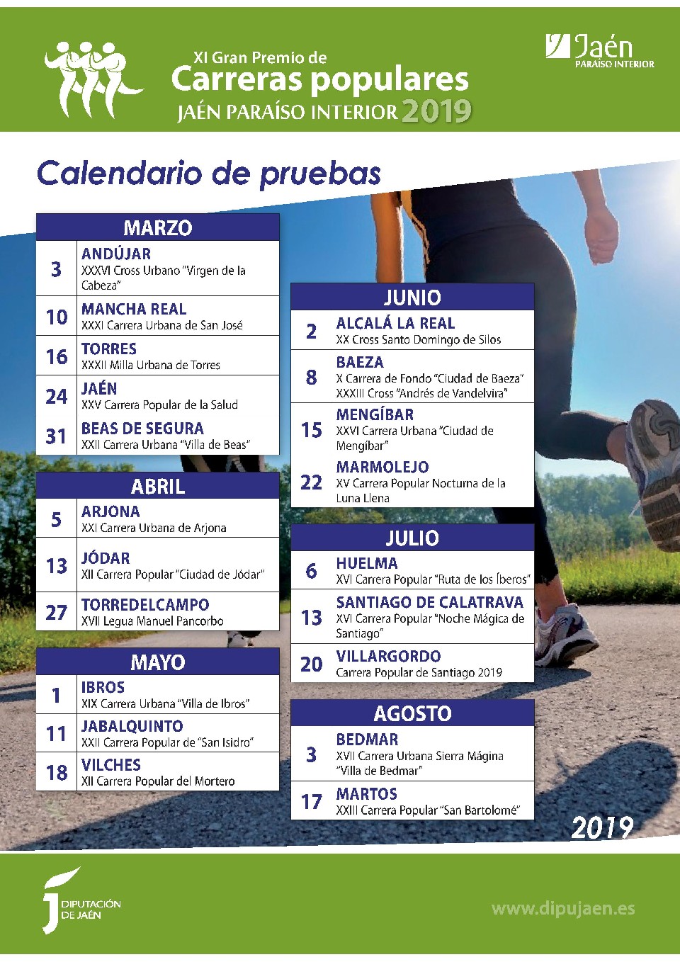 La Diputación Provincial de Jaén, a través del Área de Cultura y Deportes, con la colaboración de los Ayuntamientos de Andújar, Mancha Real, Torres, Jaén, Beas de Segura, Arjona, Jódar, Torredelcampo, Ibros, Jabalquinto, Vilches, Alcalá la Real, Baeza, Mengíbar, Marmolejo, Huelma, Santiago de Calatrava, Villatorres, Bedmar, Martos y la Delegación en Jaén de la Federación Andaluza de Atletismo, teniendo como objetivos la promoción y el fomento de la práctica del deporte, convoca el XI Gran Premio de Carreras Populares “Jaén, paraíso interior” de acuerdo con las siguientes bases:
