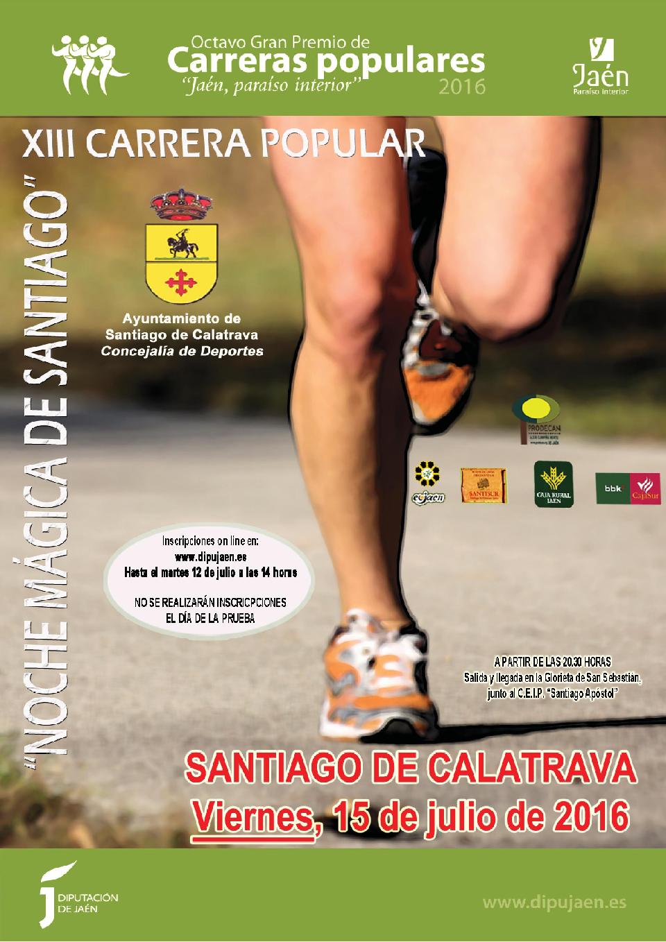 El Ayuntamiento de Santiago de Calatrava, a través de su Concejalía de Deportes, y en colaboración con la Diputación de Jaén, a través de Cultura y Deportes, y la Asociación para el Desarrollo de la Campiña Norte de Jaén -PRODECAN-, convoca, la XIII Carrera Popular “Noche Mágica de Santiago”, prueba puntuable del VIII Gran Premio de Carreras Populares “Jaén Paraíso Interior” de la Diputación de Jaén, y que consta de las siguientes bases de participación:
