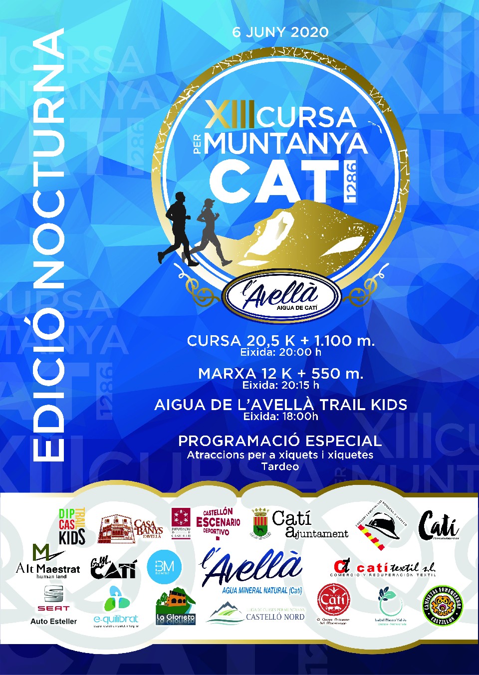 Sailkapenak CURSA 20,5Km 06/06/2020 20:00 20.5km Sailkapenak egiteke MARXA 12Km 06/06/2020 20:15 12km Sailkapenak egiteke CADETS-JUVENILS-JUNIOR - De 15 a 20 anys 06/06/2020 20:15 12km Sailkapenak egiteke Kontaktuaren informazioa Antolatzailearekin harremanetan jarri – 964409081 Araudia REGLAMENTO