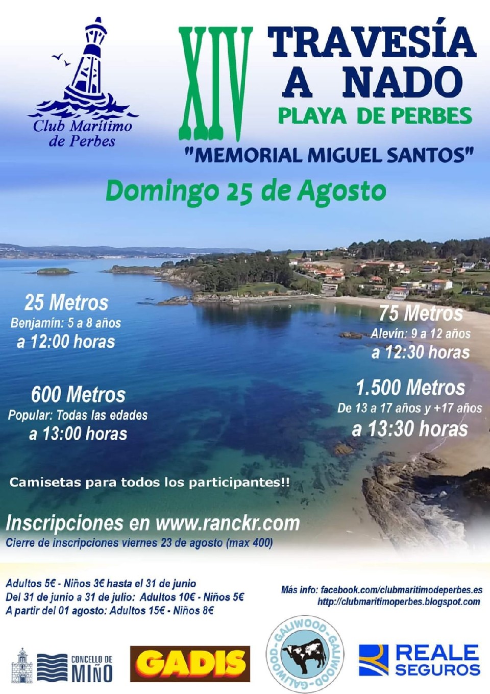Las inscripciones se realizarán a través de la plataforma web de la empresa cronometradora Ranckr.com .Éstas serán formalizadas una vez recibido el pago de la misma. El plazo de inscripción finalizará el viernes 23 de agosto de 2019 a las 23:59 horas. Se fija en 400 el máximo número de inscripciones, procediendo por riguroso orden de inscripción y pago, por lo que el plazo antes señalado podrá cambiar hasta la fecha en que se alcancen los 400 inscritos. La inscripción en la travesía supone la aceptación de este reglamento. Cobertura de riesgos: Los nadadores con licencia en vigor por cualquiera de las federaciones territoriales adscritas a la RFEN debe estar amparada por la cobertura de la correspondiente póliza de seguros. El comité organizador de la Travesía a nado Playa de Perbes “ Memorial Miguel Santos” subordina la participación de un nadador en la competición a la afirmación del mismo de pertenecer a un club reconocido por la RFEN y de que se verifican las condiciones de vigencia y validez de la póliza para la práctica deportiva federada.