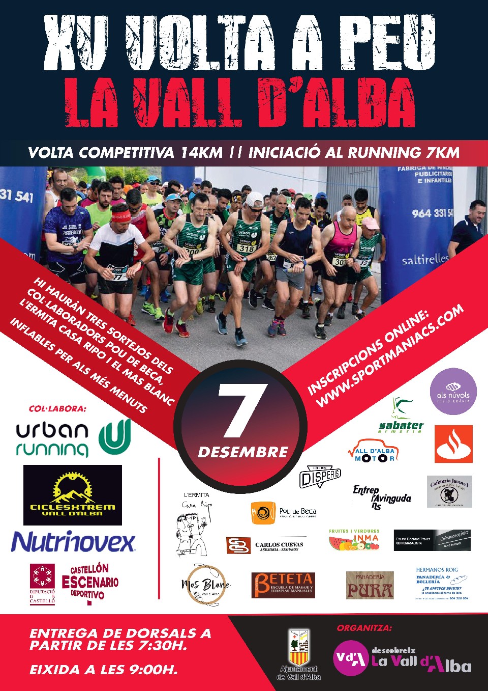 L’ esdeveniment esportiu VOLTA A PEU VALL D’ALBA, esta organitzada per l’ AJUNTAMENT DE VALL D’ALBA amb la col·laboració del GRUP SENDERISTA L’ ALBEA i CICLESXTREM VALL D’ALBA es tracte d’una prova esportiva, que a banda de promocionar la pràctica esportiva, vol donar a conèixer l’ entorn natural de la localitat i fomentar l’estima pel medi ambient. La prova es realitzarà el proper dia 7 de de desembre amb sortida desde la plaça de l’Ajuntament i arribada al Pavelló Poliesportiu.