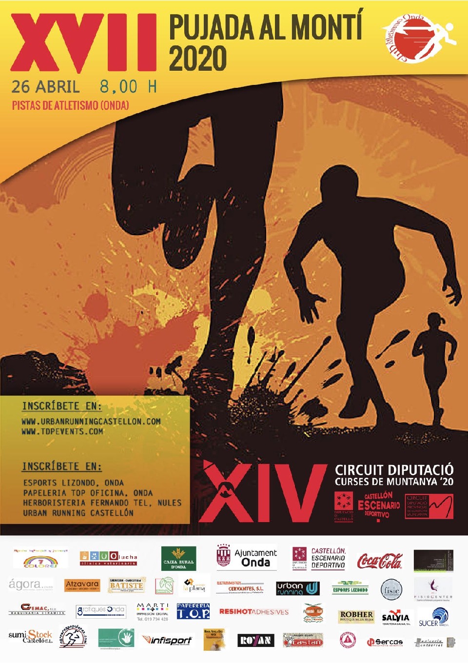 El Club Atletismo Onda organiza la XVII PUJADA A MONTÍ, que se celebrará el domingo 26 de ABRIL de 2020 a partir de la 08:00 horas. 1. La prueba es de carácter popular deportiva de fondo por montaña, que tiene como objetivo fomentar las pruebas de resistencia por montaña. El tiempo máximo de la prueba es de 04:30 horas. 2. Esta prueba es puntuable para el XIV Circuito diputación provincial de carreas por montaña. A todos los participantes al finalizar el Circuito Diputación que consta de 6 pruebas se entregara un OBSEQUIO-FINISHER. 3. Su recorrido será aproximadamente de 19.000 metros con un desnivel acumulado de 990.52 metros y transcurrirá en su mayor parte por un circuito de caminos y pistas forestales y el resto por trazado urbano. La salida y la meta estarán situadas en la Pista de Atletismo “L’OLIMPIC”. 4. Durante el recorrido habrá cuatro puestos de avituallamiento con agua e isotónico y dos de ellos con alimentos sólidos. 5. El cronometraje de la prueba será realizado por la empresa TDPEVENTS. 6. No podrá participar en dicha prueba menor de 16 años. Las categorías serán las siguientes: CATEGORÍAS: Junior / Promesas (18 a 23 años) Senior mas/fem. (24 a 39) años Veteranos / as A. (40 a 49 años) Veteranos / as B. (50 a 59 años) Veteranos/ as C. (60 años en adelante) CATEGORIA LOCAL mas/fem. 7. Se descalificará a cualquier corredor que: ensucie el entorno, incumpla el recorrido y no lleve el dorsal en lugar visible, y falsee dorsal asignado con otra identidad, (la organización establecerá puntos de control a lo largo del circuito). 8. Trofeos, obsequios y premios: Se entregará trofeo a los tres primeros Absolutos y a los tres primeros clasificados de cada categoría masculino y femenino. Los premiados con trofeos son acumulables. La entrega de trofeos será a las 12:30 horas. 9. Todo corredor correctamente inscrito cuenta con una póliza de seguro de accidentes, que cubre cualquier contingencia durante el desarrollo de la carrera. 10. La salida será el domingo 26 de ABRIL a las 08:00 horas desde la pista de atletismo L’OLIMPIC. - La entrega de dorsales comenzará el DOMINGO día 26 desde 6’30 horas, hasta 15 minutos antes de iniciarse la prueba. - Sera necesario, presentar el DNI o documento acreditativo del corredor, para retirar el dorsal no se dará ningún dorsal si no enseña el documento del corredor inscrito. - A todos los participantes que acaben la prueba se les obsequiará con una bolsa del corredor y lo que la organización pueda recaudar. Y sorteo entre los participantes, de unas zapatillas JOMA. 11. Las inscripciones se podrán realizar, por cualquiera de los siguientes medios: - ON LINE: sportmaniacs.com - ON LINE: www.tdpevents.es TIENDAS: - URBAN RUNNING CASTELLÓN Avda. Pérez Galdós 4 bajo - ESPORT LIZONDO: C/ Francesc Ferrer Pastor, 13 (Onda) - PAPERERÍA T.O.P: C/ Carta Pobla 7-Local 5. (Onda) - HERBORISTERÍA Fernando Tel (Nules) - OFICINAS del club pista de atletismo 1º piso (ONDA). El precio de la inscripción: - 14€ del 1 de febrero hasta el 12 abril. - 17€ del 13 de abril al 22 de abril No se admitirán inscripciones fuera de plazo. 12. La prueba estará dirigida por la organización. Cualquier impugnación sobre participación, clasificación, etc., será competencia del juez-árbitro, haciéndose por escrito, bajo depósito de 60€, y dentro de la media hora posterior a la comunicación oficial de las clasificaciones. 13. La organización podrá exigir la presentación del DNI, si lo cree conveniente, a los atletas vencedores en las distintas categorías. 14. Los únicos vehículos autorizados para seguir la prueba, serán los que designe la organización. 15. La organización declina toda responsabilidad por los daños que la participación en esta prueba pueda causar a cualquier corredor, también pueda causarse a sí mismo. 16. El servicio de ambulancias de la estará ubicado en las inmediaciones de la meta y puntos estratégicos. 17. Todos los participantes, por el hecho de tomar la salida aceptan el presente reglamento. 18. Para cualquier consulta sobre la organización, se puede llamar al teléfono TDPEVENTS 639 344 144 y Andrés Tomaseti 678 593 025. www.tdpevents.es www.atletismeonda.blogspot.com 19. Información General. Habrá servicio de duchas en la Pista de Atletismo. También hay parking en la zona del campo de fútbol y pabellón contiguos a la Pista. Se ruega no aparcar por la zona del recorrido de la prueba.