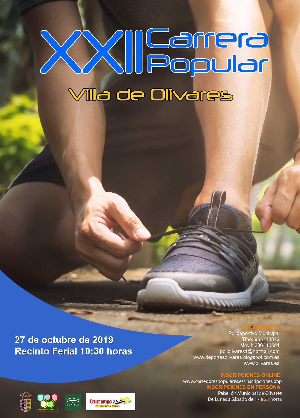 - Personalmente, en el pabellón Municipal de Olivares, en horario de 17:00 a 21:00 horas, de Lunes a Sábado, desde 17/09/19 al 25/10/19. Por tanto, no se admitirán inscripciones el mismo día de la carrera.