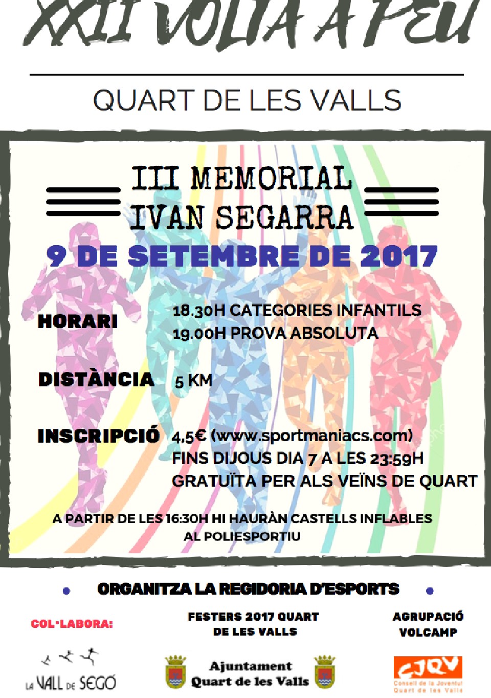 Art. 1) La Regidoria d’Esports de l’Ajuntament de Quart de les Valls organitza la XXII Volta a Peu a Quart de les Valls III Memorial Iván Segarra amb la col·laboració dels Festers de 2017, C.A. La Vall de Segó i altres organismes.